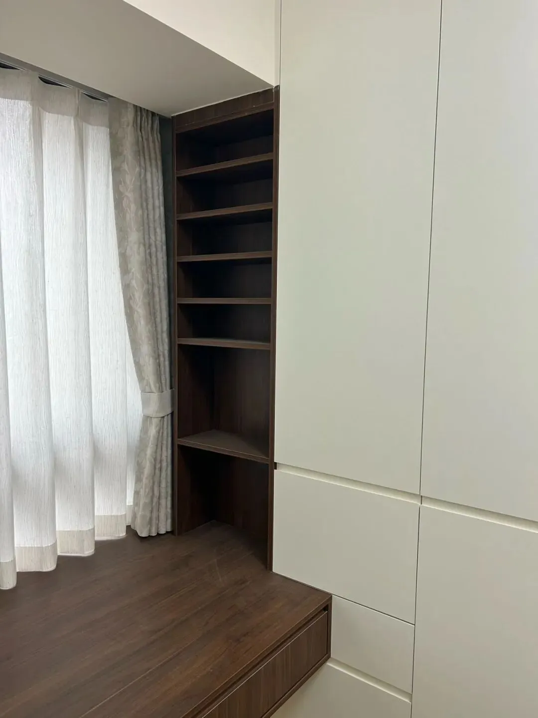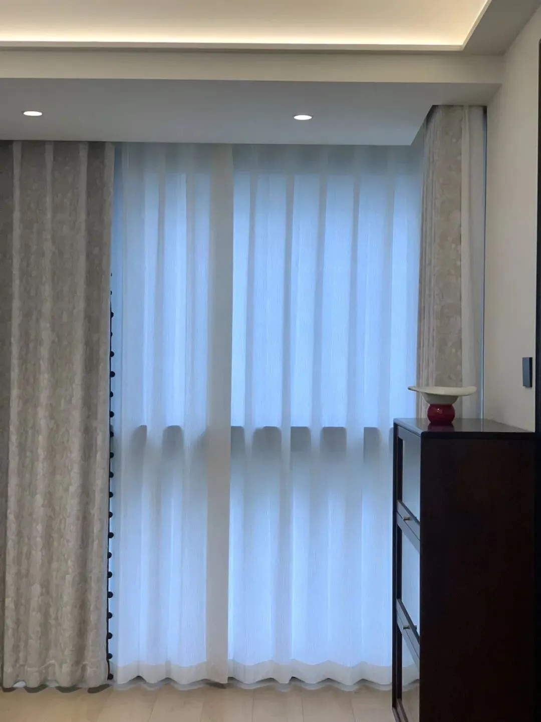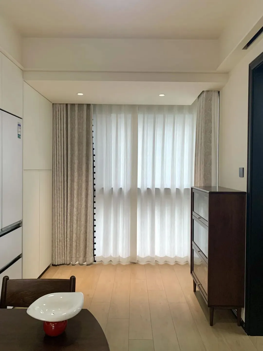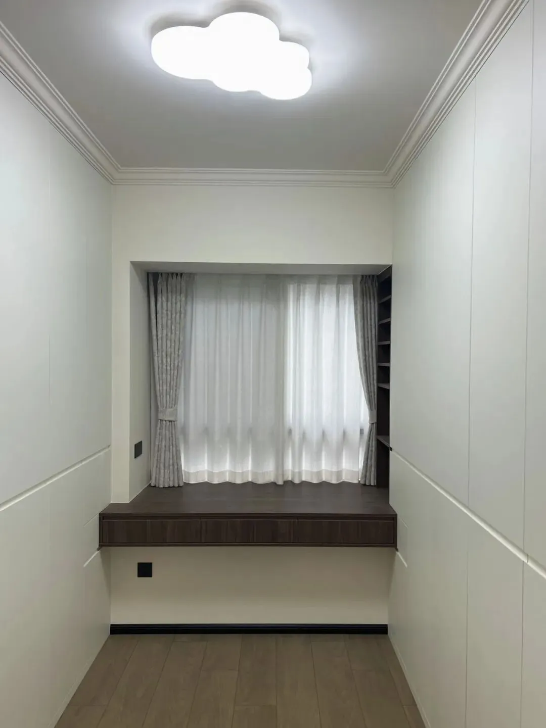 从设计图纸到实景落地,我们实现了近乎1:1的完整复刻。一眼望去,尽头的灯光形成自然的视觉落点,让原本狭长的走廊有了恰到好处的纵深感与故事感,不再是单纯的“过路空间”,而是成为贯穿全屋的颜值中轴线,让每一次归家的动线,都藏着不期而遇的温柔好的居住质感,从来都不止于大空间的惊艳呈现,更藏在每一处容易被忽略的细节里。公卫的入口,也是和全屋风格的第一个呼应点。选用了黑色复古拱形玻璃门,让公卫门不再是空间里的“突兀存在”,而是成为全屋弧形设计语言的延伸。水波纹压花玻璃,既保证了卫生间的隐私性,又能透过柔和的光线,避免小空间的压抑感;搭配亮面金色门锁五金,在细节处守住了风格的统一性。在衣帽间的柜体设计上,我们始终坚持「简洁至上,实用为王」的原则,以温润的原木质感,承载起日常收纳的所有需求,让衣帽间不止能装,更有治愈的温柔质感。