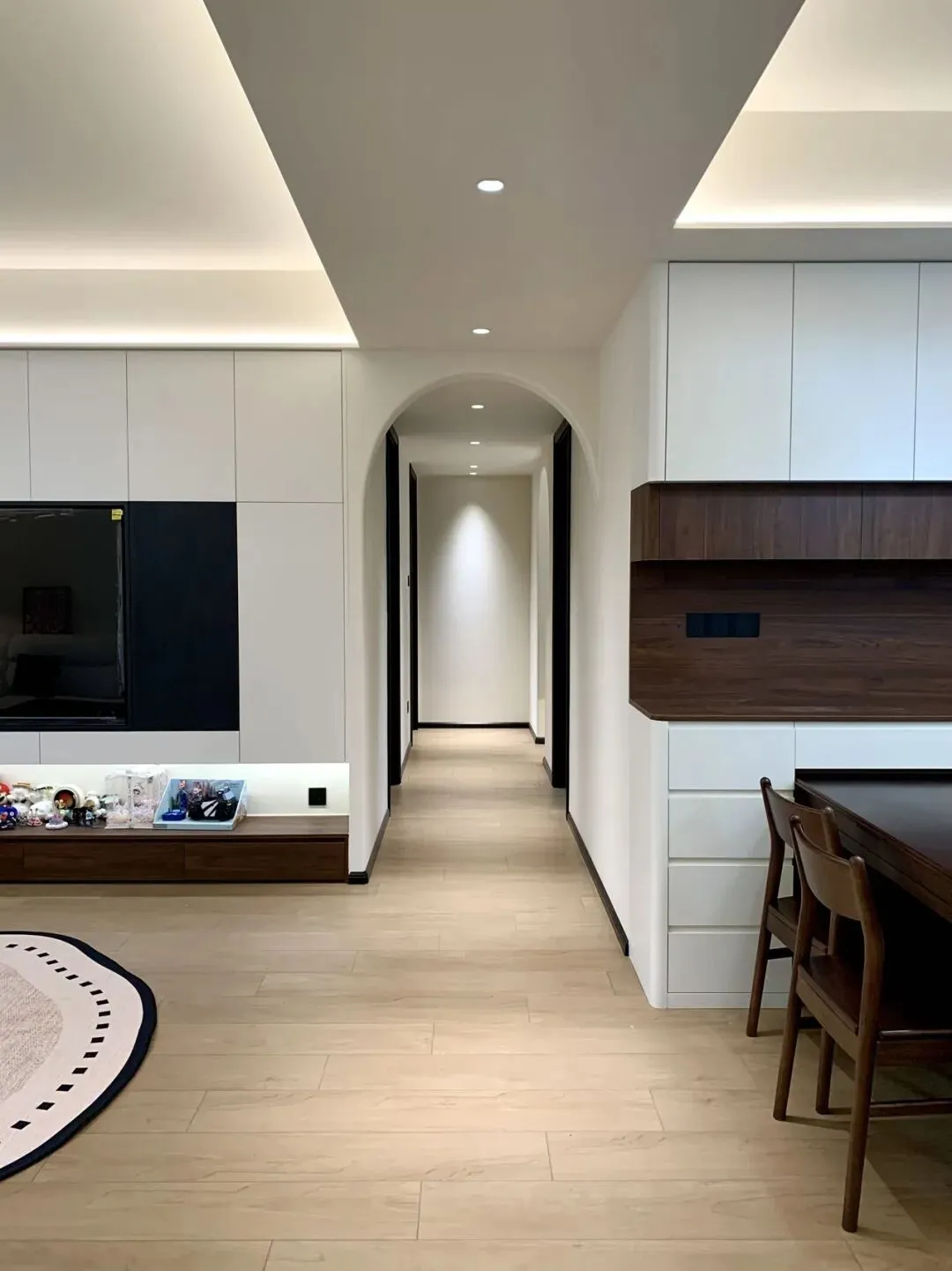在这套户型里,过道是连接客餐厅公共区域与卧室私密区的核心动线,也是我们在设计中重点打磨的视觉亮点。