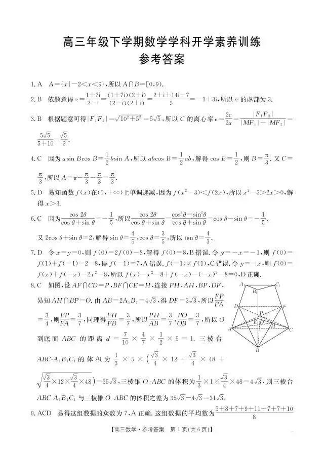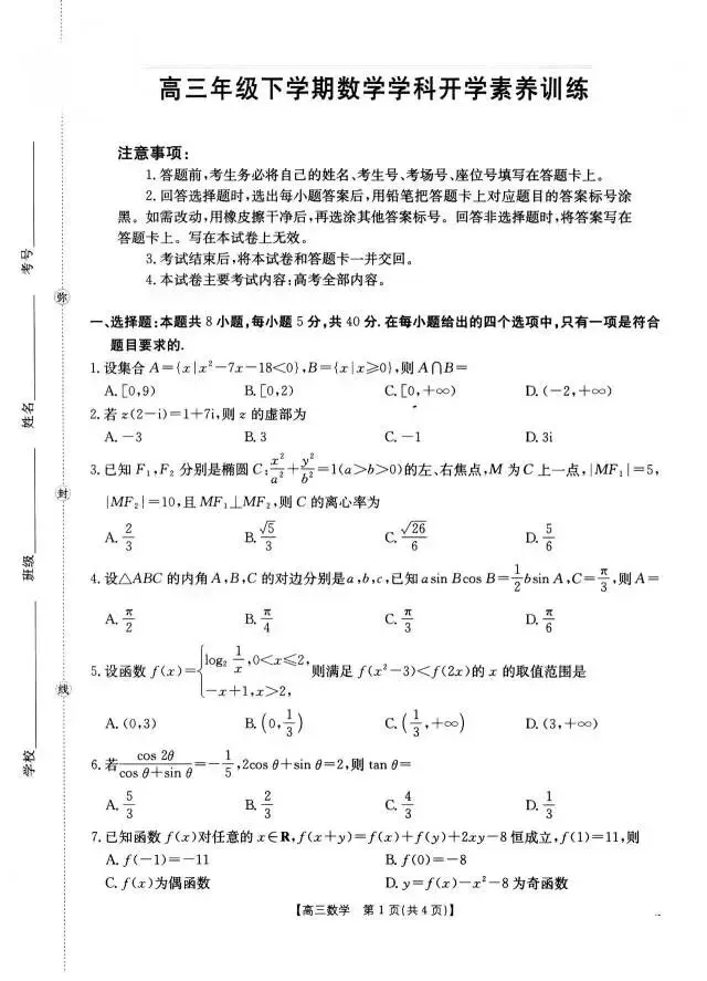 江西省南昌市2026届高三3月开学考试数学试题