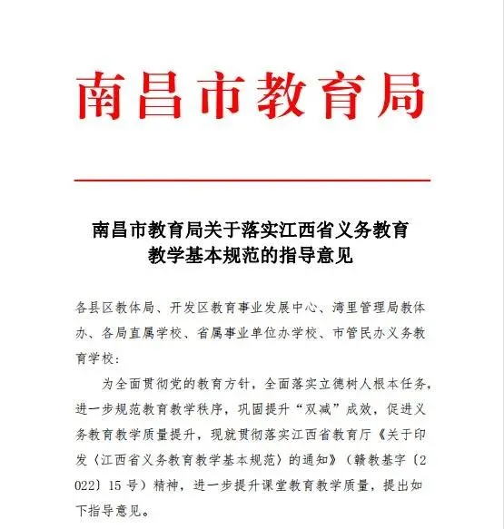 《江西省义务教育教学基本规范的指导意见》全面贯彻党的教育方针,根据党中央国务院关于教育改革和“双减”工作部署要求制定,引领教师按照教学常规履职,从课程设置、备课环节、课堂教学、作业设计、考试评价、家校合作六个方面具体指导教育教学行为,落实立德树人根本任务,减轻学生过重学业负担,保障学生全面发展、健康成长。