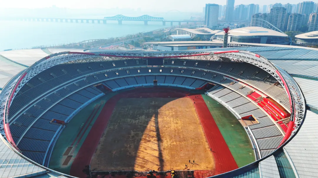 在70米高的体育场穹顶,工人们有序安装灯光设备;正在翻新的主队更衣室内,工人们不停挥着铁铲刮平墙面。原有的草坪早已铲除,覆上了厚厚的沙层;塑胶跑道拆除完毕,等待下一步施工。
