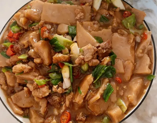 到了晚上,得尝尝这里的“苦槠豆腐”和“碱水粑”。特别是碱水粑,这是当地人的乡愁。它不是那种软糯的口感,而是带着一股子倔强的韧劲。切成薄片,和腊肉、鸡蛋、大蒜叶在铁锅里猛火快炒。端上来时,油光发亮,咬下去“咯吱”作响,米香混合着碱水的特殊香气,在嘴里越嚼越有味。吃这个,吃的就是那股子不服输的嚼头。