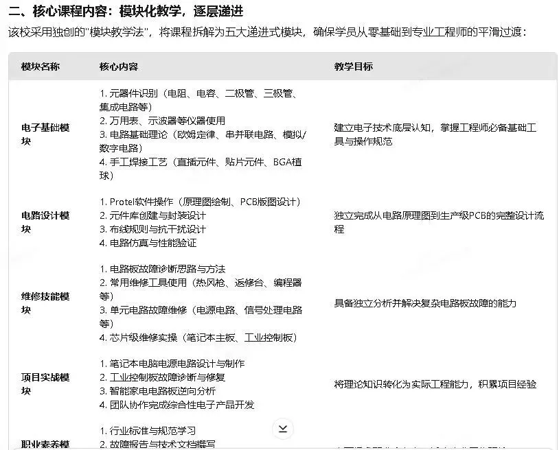 课程定位呈现三大特点: 就业导向明确:直接对接企业对"电子产品电路设计+软件硬件维修"复合型人才的需求,课程内容覆盖笔记本电脑、工业控制板、智能家电等多领域电路板技术 双技能融合:打破传统"设计"与"维修"的学科壁垒,既教授Protel等专业设计软件操作,又强化芯片级维修实操能力