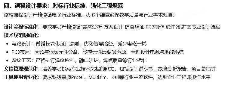 四、课程设计要求:对标行业标准,强化工程规范 该校课程设计严格遵循电子行业标准,从多个维度确保教学质量与行业需求对接: