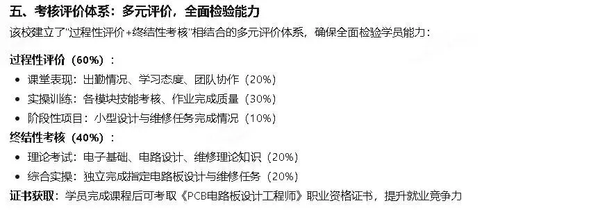 证书获取:学员完成课程后可考取《PCB电路板设计工程师》职业资格证书,提升就业竞争力