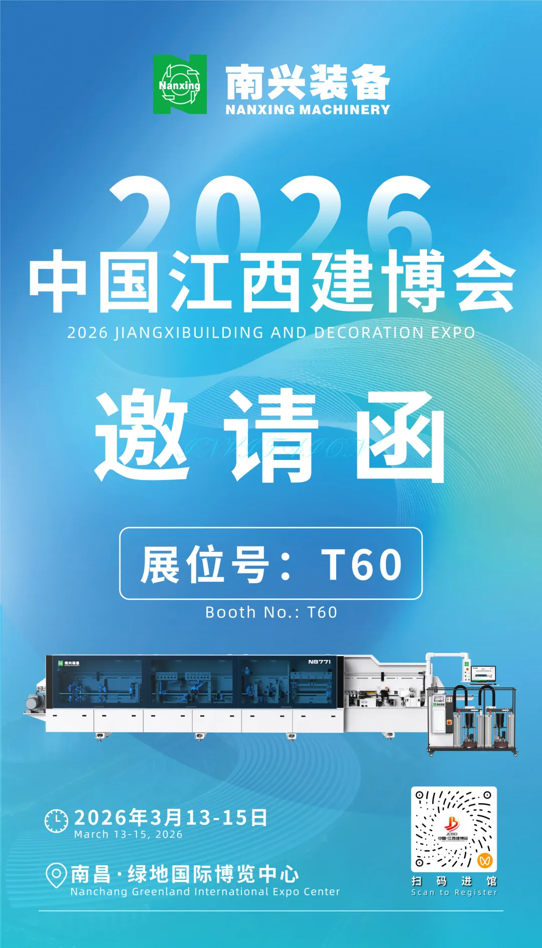 The 2026 JIANGXIBUILDING AND DECORATION EXP will be held from March 13th to 15th at the Nanchang Greenland International Expo Center. Nanxing, booth number T60, specializing in cutting, edge banding, and drilling, cordially invites you to visit our booth.