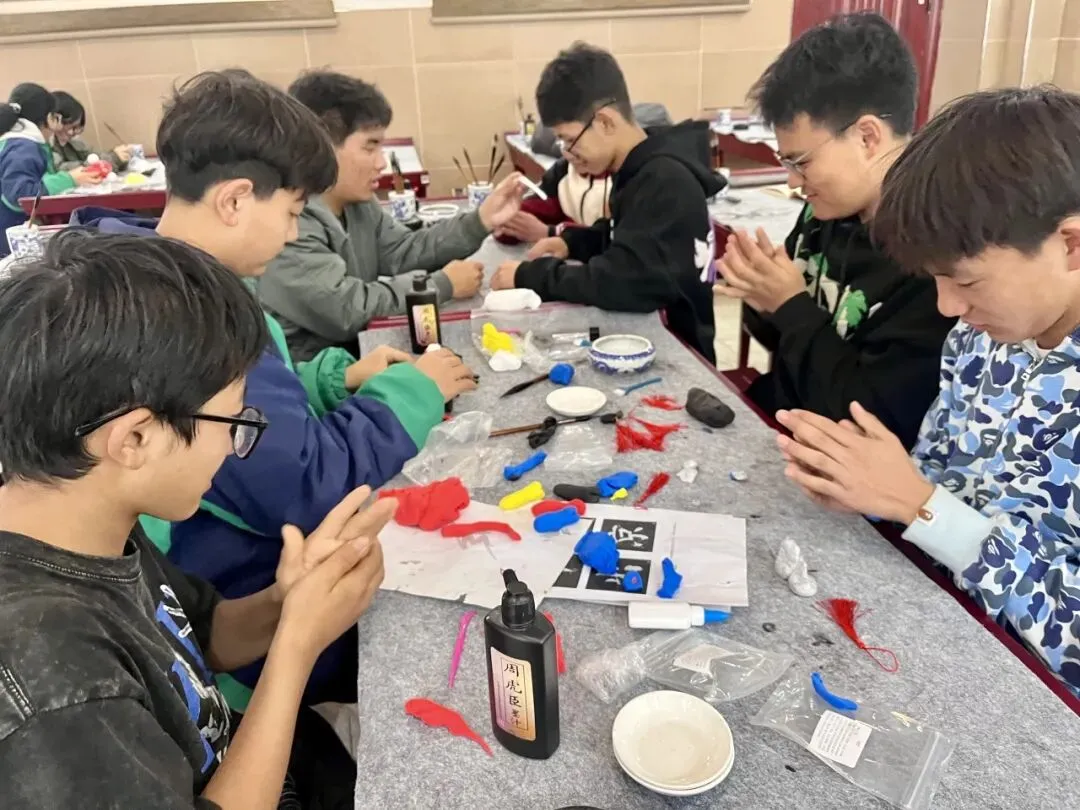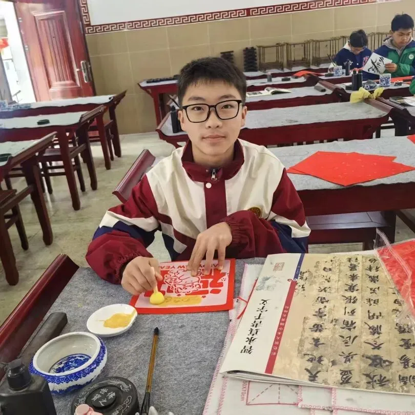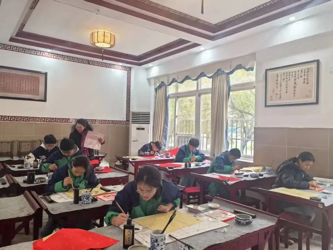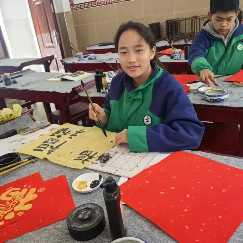 下午,书法教室举行写福字、拓印活动。红纸铺开,同学们拿起毛笔,蘸墨、起笔、落笔。一个个“福”字和“春”字跃然纸上,有的端正工整,有的笔触稚嫩,透着浓浓的年味。