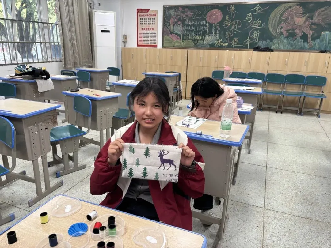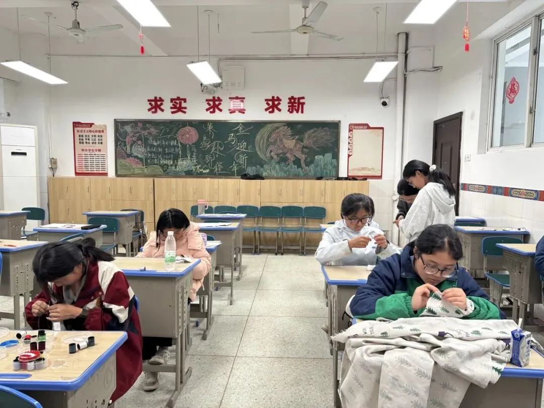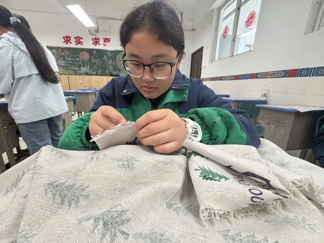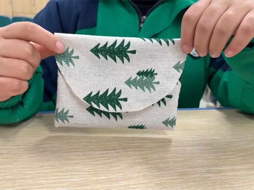 正月初七,生活技能大比拼在教室里举行。老师先示范缝纫步骤,讲解要领。随后同学们拿起针线,在布料间穿针引线,缝制小包。虽然针脚不够整齐,但每个人都认真完成了自己的作品。