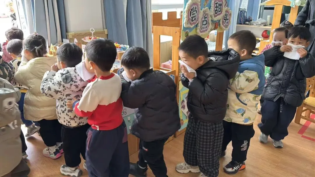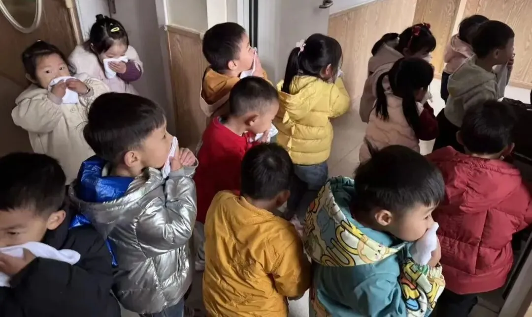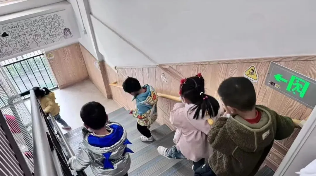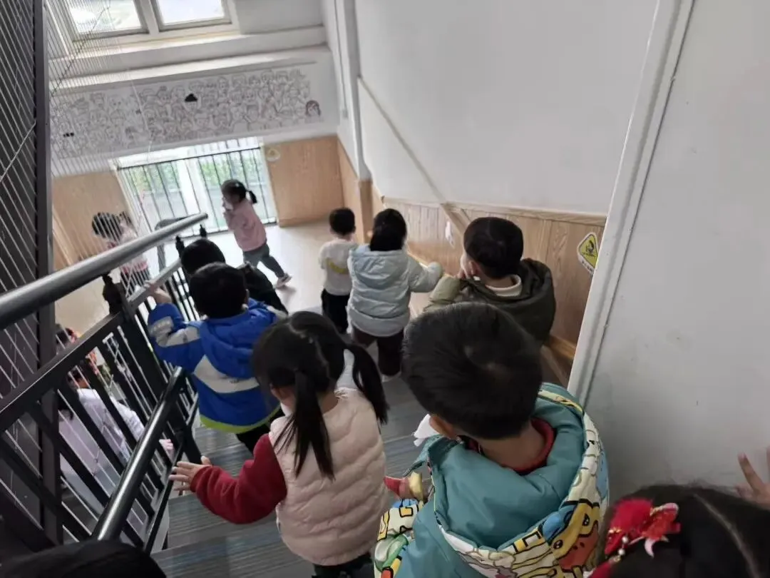 双手捂住口鼻,小腰弯得像只小猫咪,沿着墙壁快速撤离;走廊里没有拥挤,没有哭闹,只有老师的指引和孩子们认真的小脸蛋。