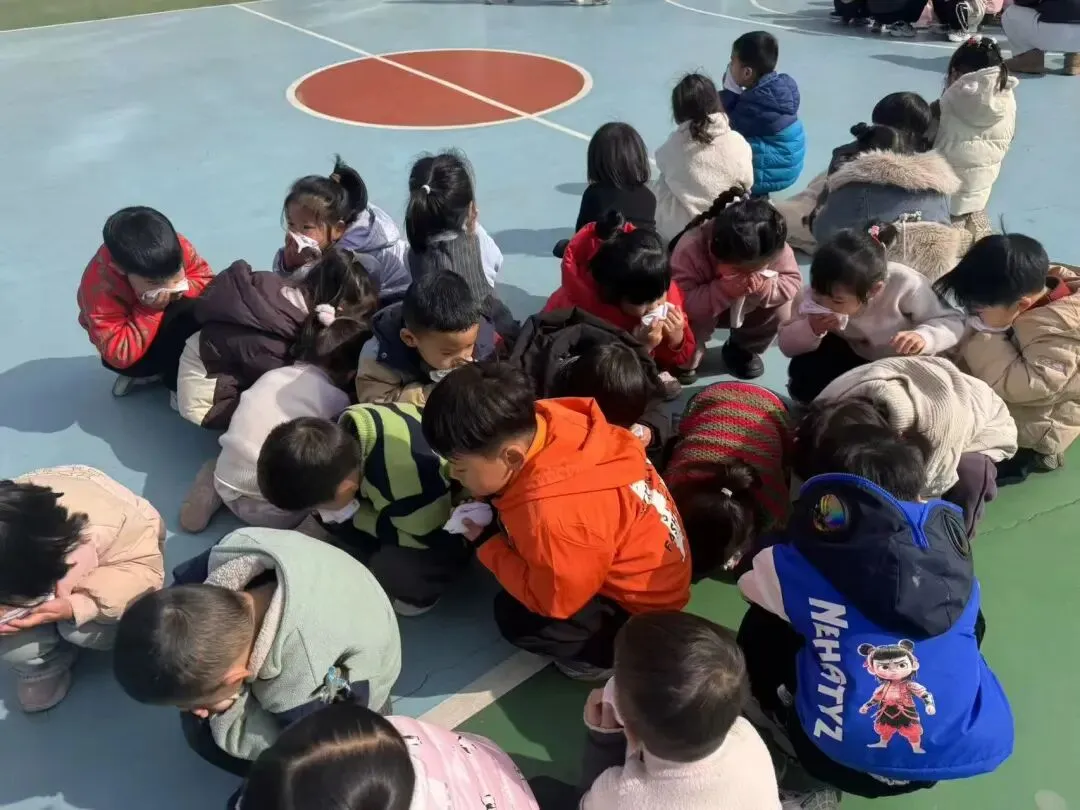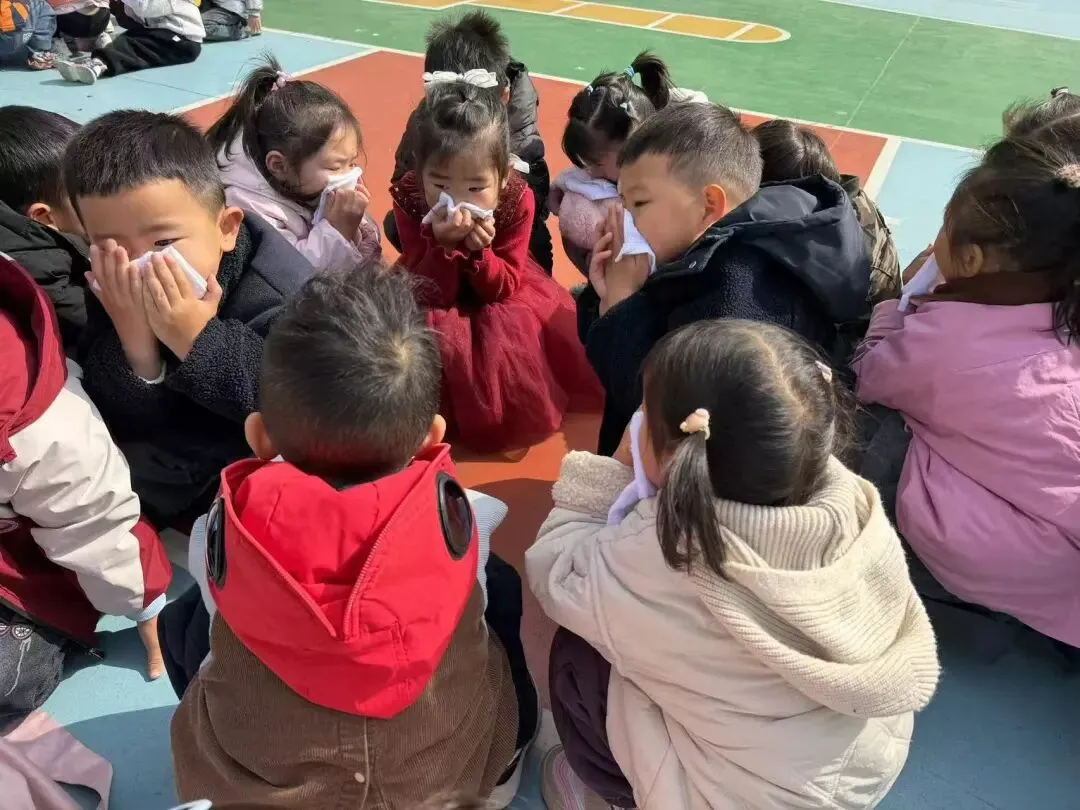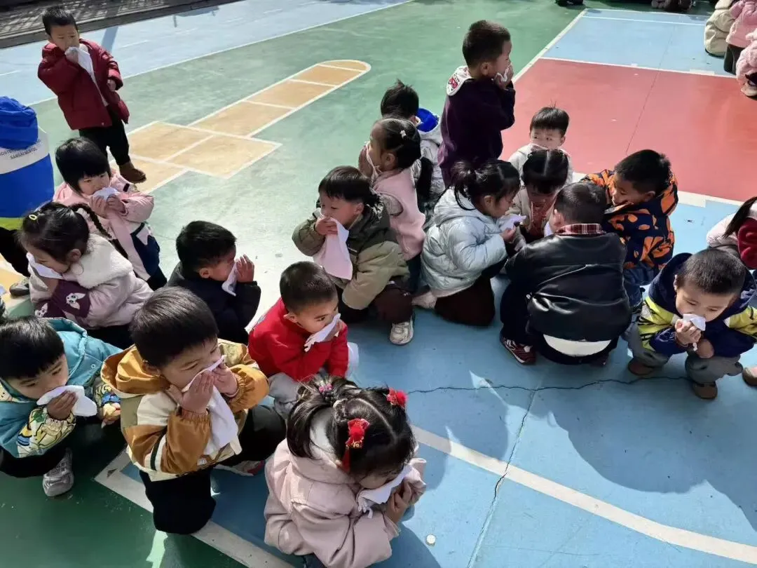 全体师幼疏散至指定地点集合,做到了安全、快速、有序。疏散到安全位置后,各班教师引导幼儿用湿毛巾捂住口鼻蹲在原地并及时查看幼儿情况,并向负责人汇报了班级应到、实到人数。