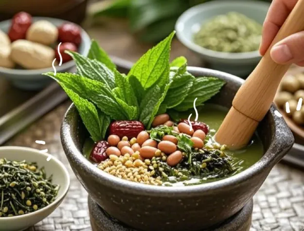 擂茶:不是茶,是汤这东西讲究个"擂"字。茶叶、芝麻、花生、草药扔进陶钵里,用茶树木杵使劲捣碎,捣成泥,冲入滚水。不是甜的,是咸的。第一口可能不习惯,带着草药的涩和薄荷的凉,但咽下去,胃里暖烘烘的,人就醒了。