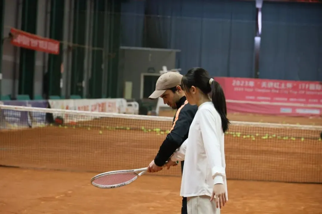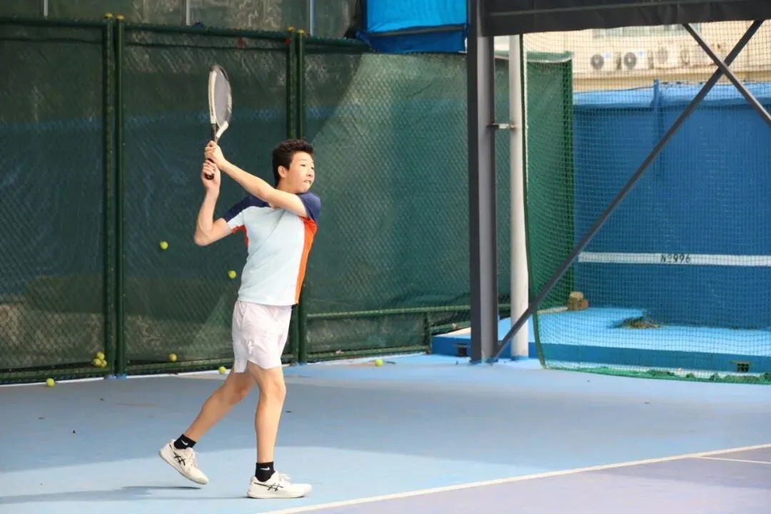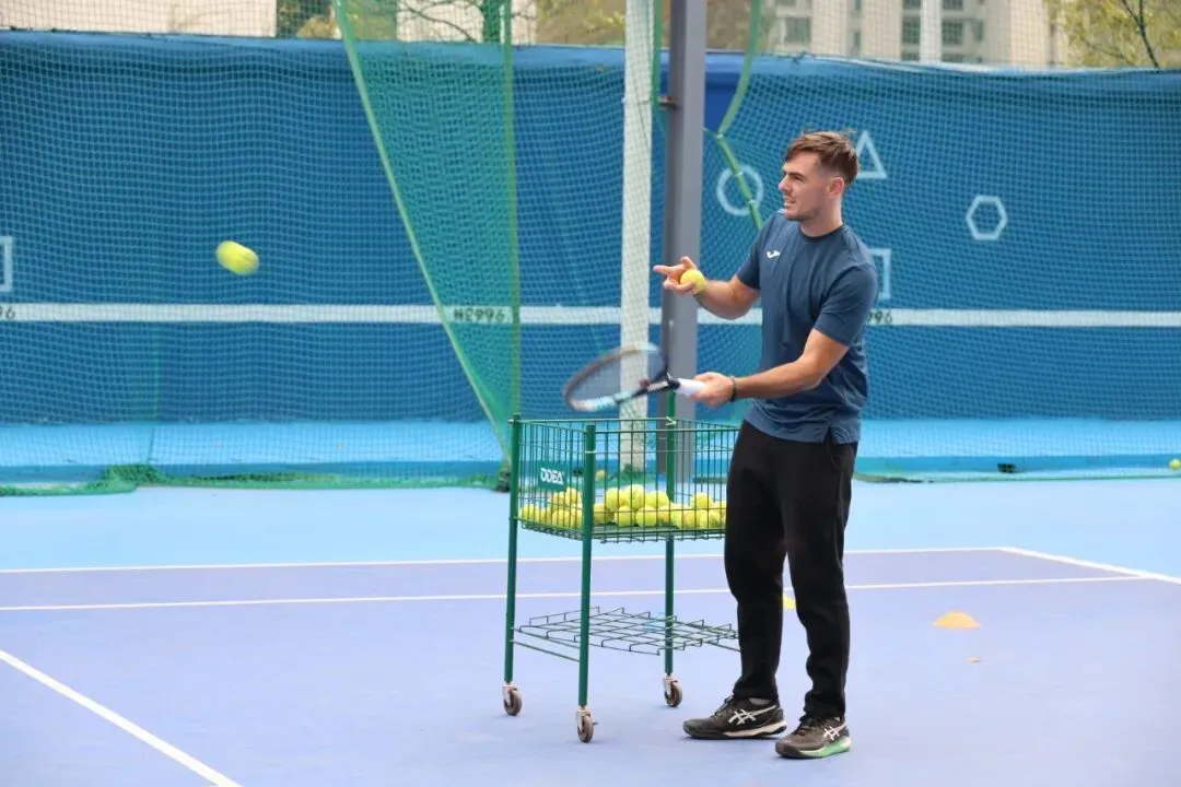 另一片场地上,外教指导:“击球点靠后了,注意提前引拍。”一筐筐球补上,教练的耐心永远在线。