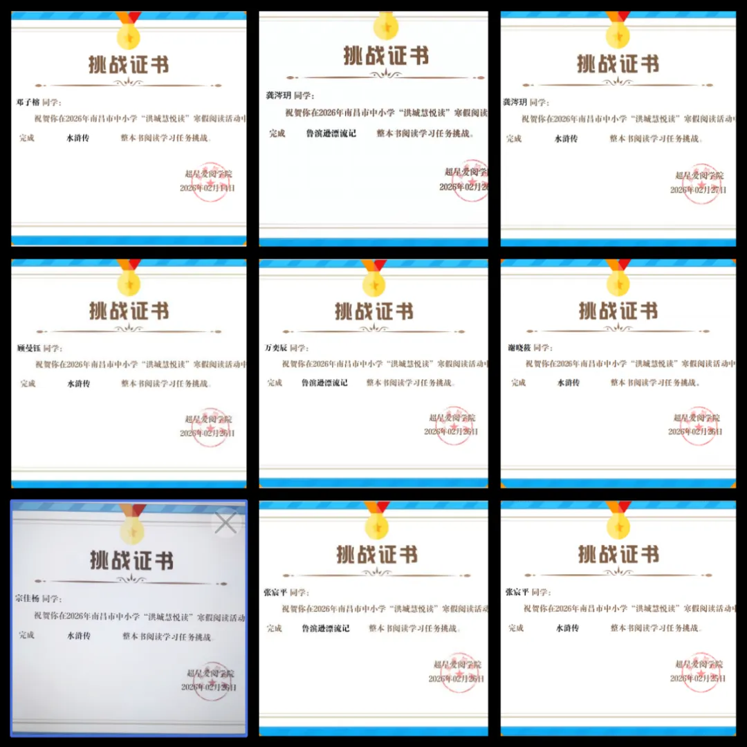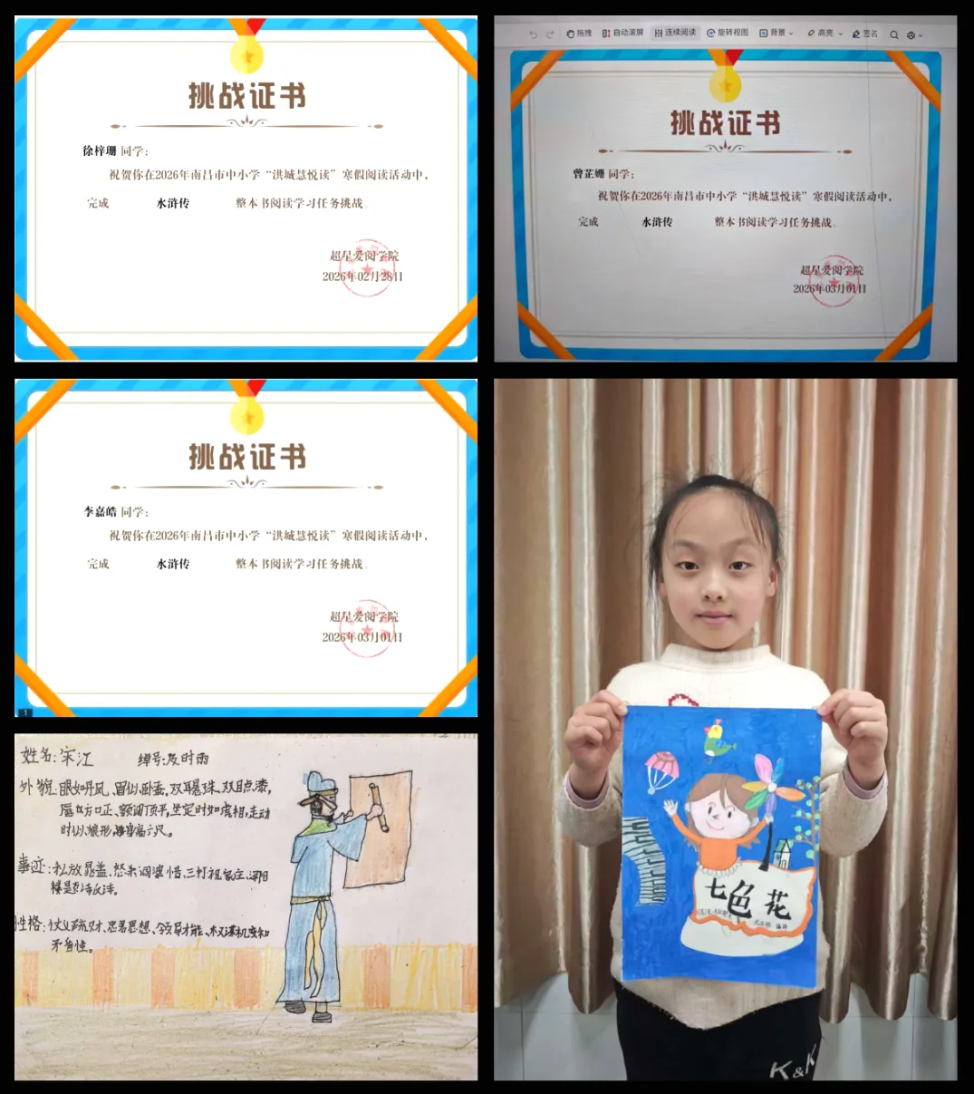 同学们积极响应校园寒假读书邀约,按年级循着推荐书目开启深度阅读,低年级品读童谣儿歌、儿童故事,高年级研读经典名著、科普读物;同时将阅读中的所思所感整理成读书心得、制作故事情节图、人物档案袋、好词好句摘录卡等趣味阅读衍生作品;踊跃参与南昌市 2026 年 “洪城慧悦读” 寒假闯关、南昌大学寒假线上共读等优质读书活动,在读思悟行中汲取智慧,让悦读成为假期成长的重要底色。