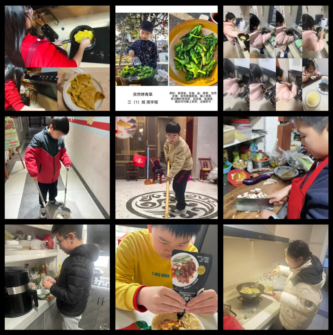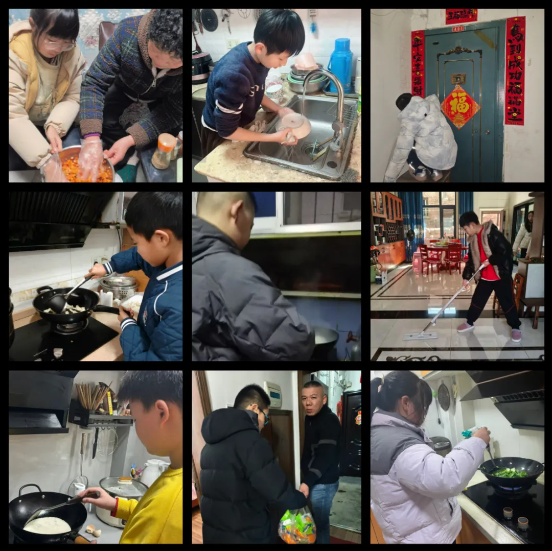 同学们化身 “小小劳动家”,主动分担拖地、择菜、洗碗等日常家务,还参与包饺子、贴春联等年俗劳动,亲手制作特色美食,在动手实践中体会劳动乐趣、学会独立自理,涵养责任与担当。