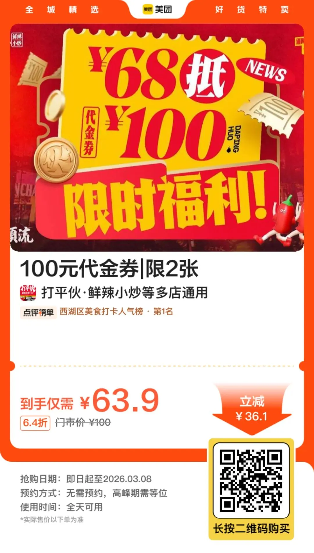 >南昌网红「打平伙·鲜辣小炒」优惠券:63抵100可叠加