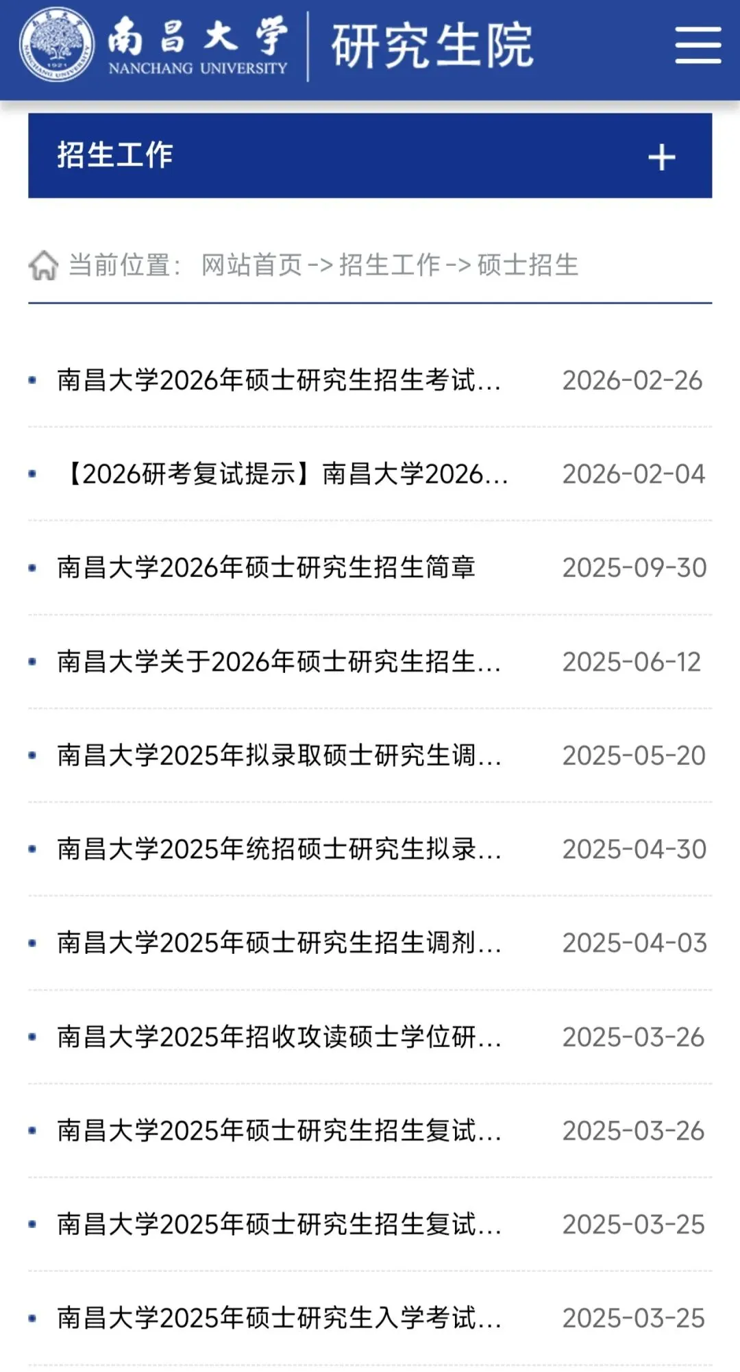 南昌大学关于招收研究生的所有通知都会放在这个网站上,像招生简章、报名、录取情况、调剂信息等都会在这个网站上通知。