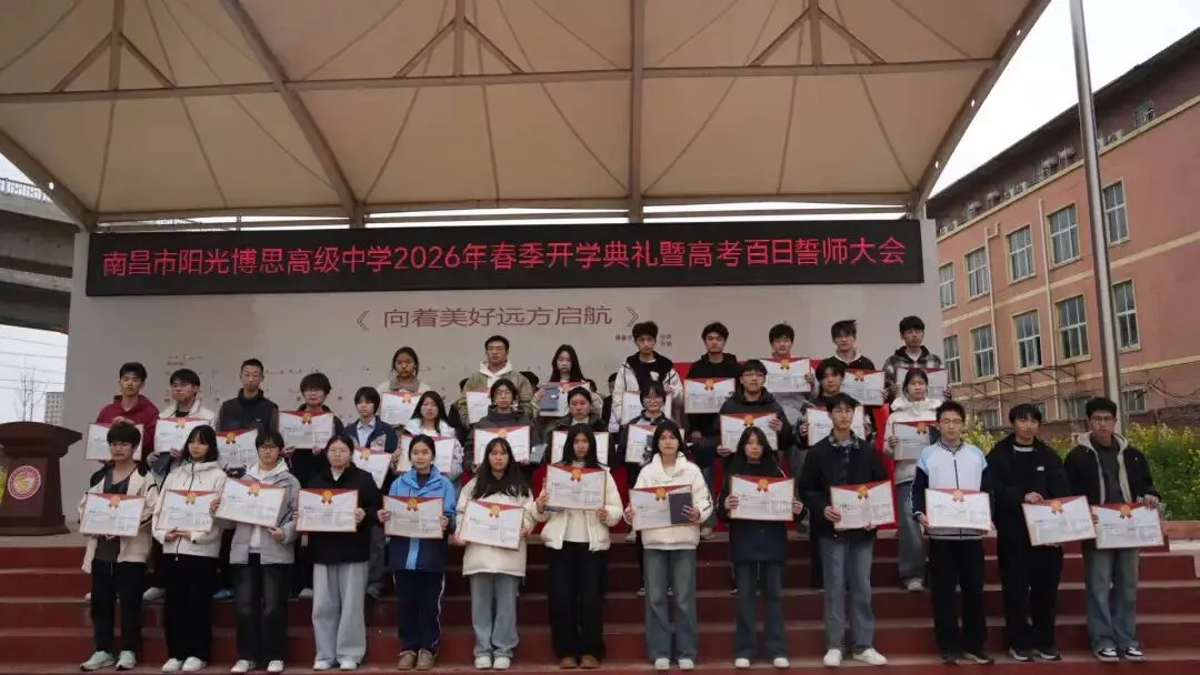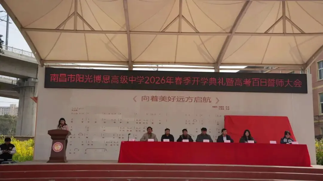 2026年3月6日下午14时,南昌市阳光博思高级中学全体师生齐聚校园运动场,隆重举行2026年春季开学典礼暨高考百日誓师大会。本次大会以“春启新程逐梦远,百日砺剑战高考”为主题,既是新学期的启航号角,更是高三学子冲刺高考的出征誓言。