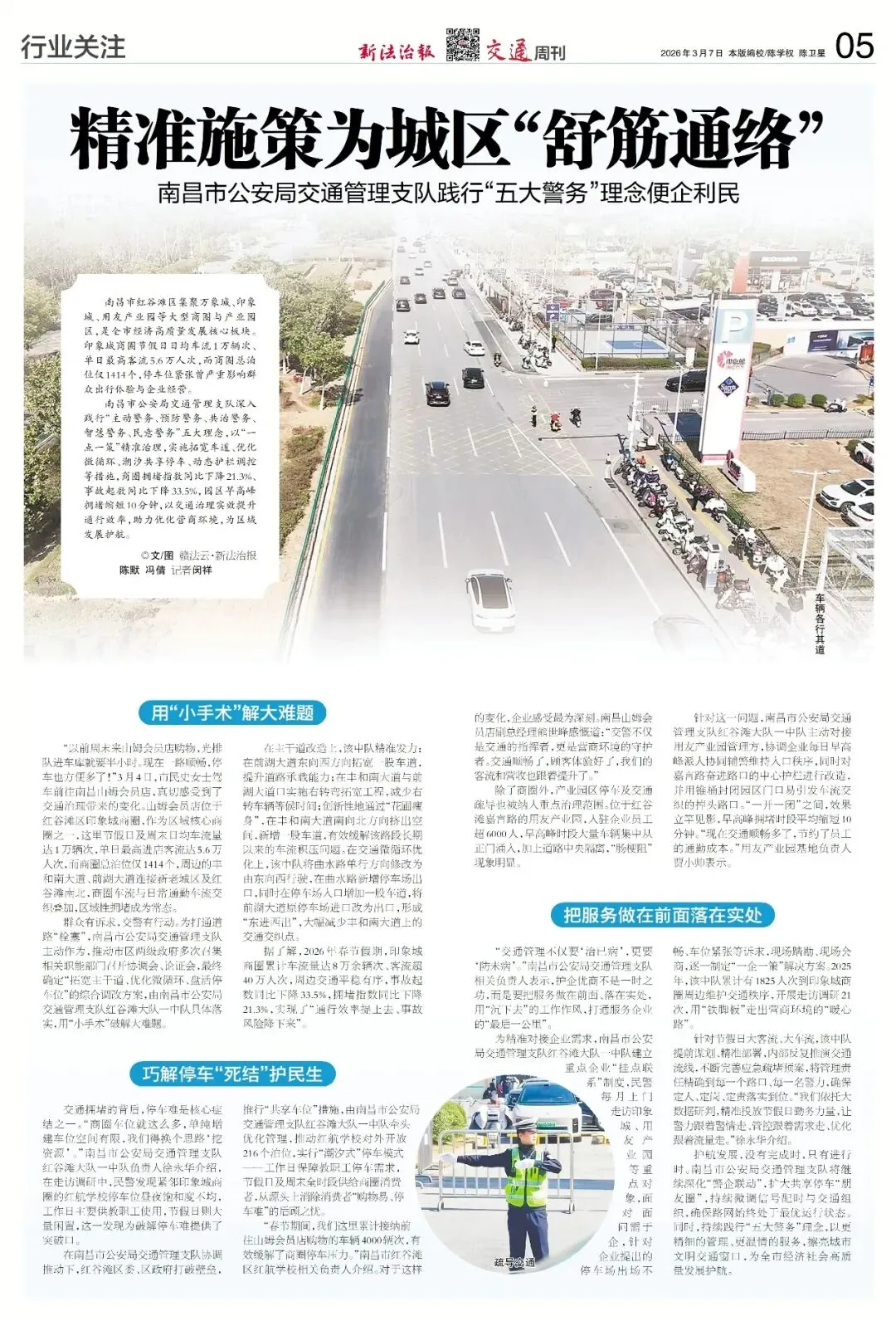 南昌市公安局交通管理支队深入践行"主动警务,预防警务,共治警务,智慧警务,民意警务"五大理念,以"一点一策"精准治理,实施拓宽车道,优化微循环,潮汐共享停车,动态护栏调控等措施,商圈拥堵指数同比下降21.3%,事故起数同比下降33.5%,园区早高峰拥堵缩短10分钟,以交通治理实效提升通行效率,助力优化营商环境,为区域发展护航。