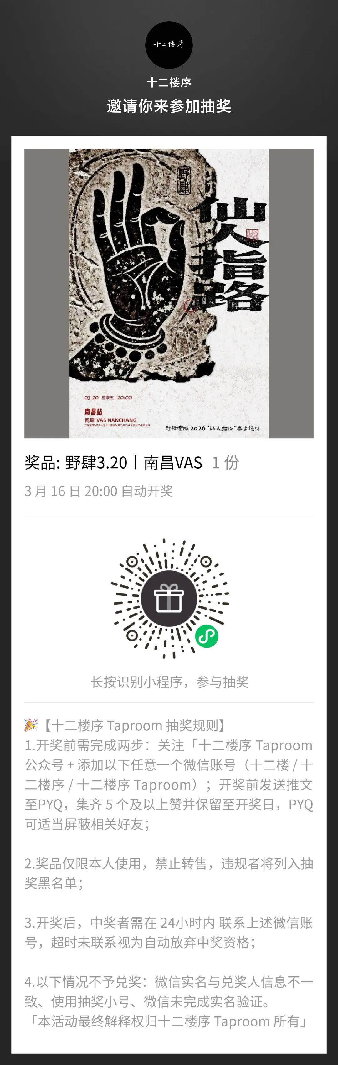 1.开奖前需完成两步:关注「十二楼序 Taproom」公众号 + 添加以下任意一个微信账号(十二楼「SHIERLOUXU2」 / 十二楼序「SHIERLOUXU1」 / 十二楼序 Taproom);开奖前发送推文至PYQ,集齐 5 个及以上赞并保留至开奖日,PYQ可适当屏蔽相关好友;