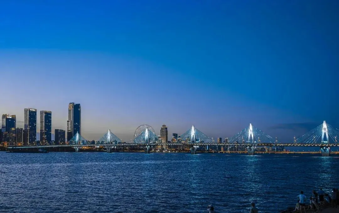 傍晚追蓝调时刻,江面与灯光温柔交融