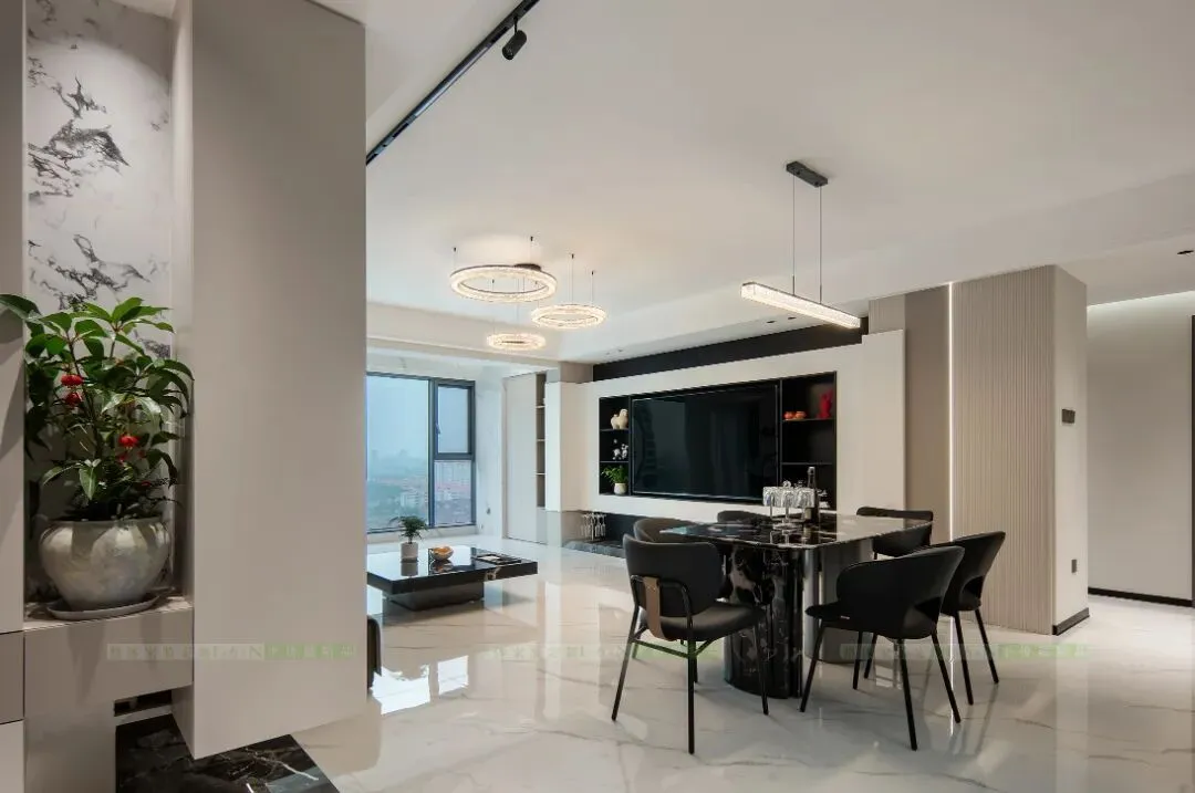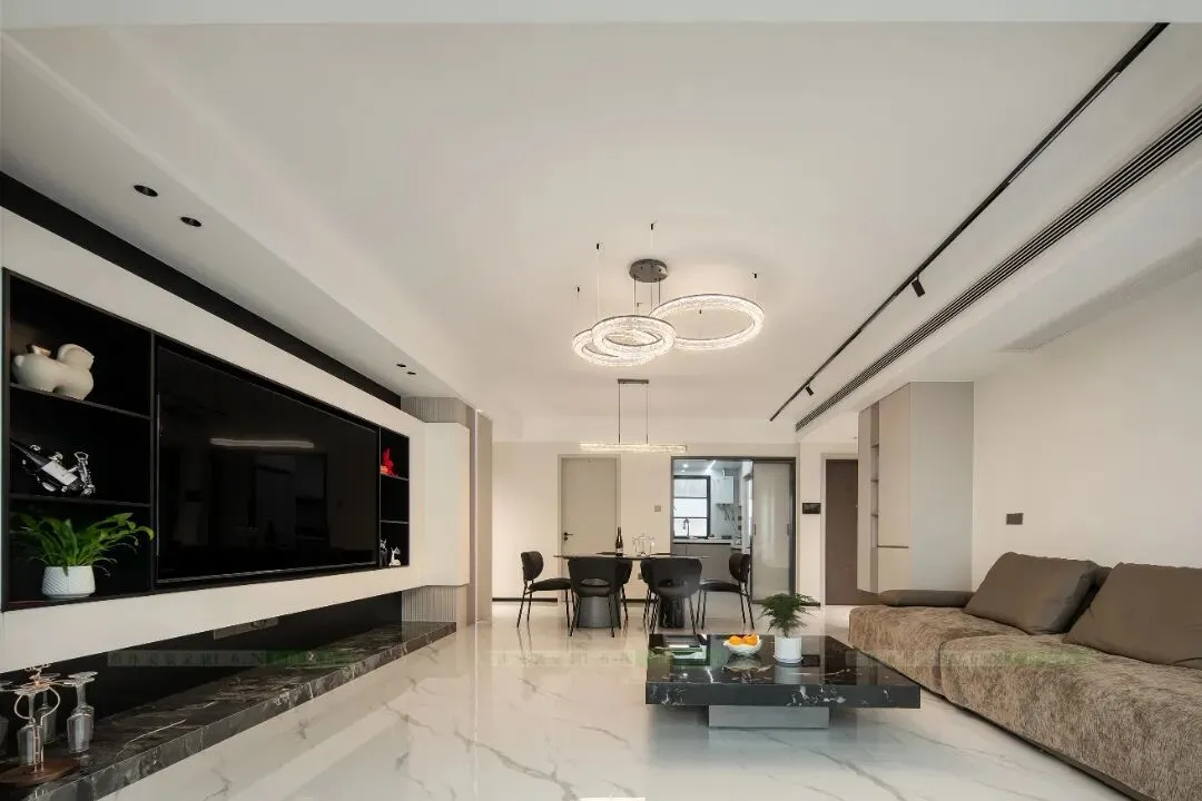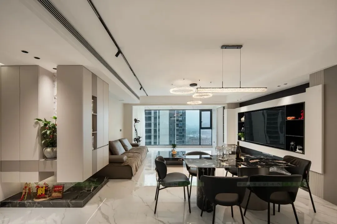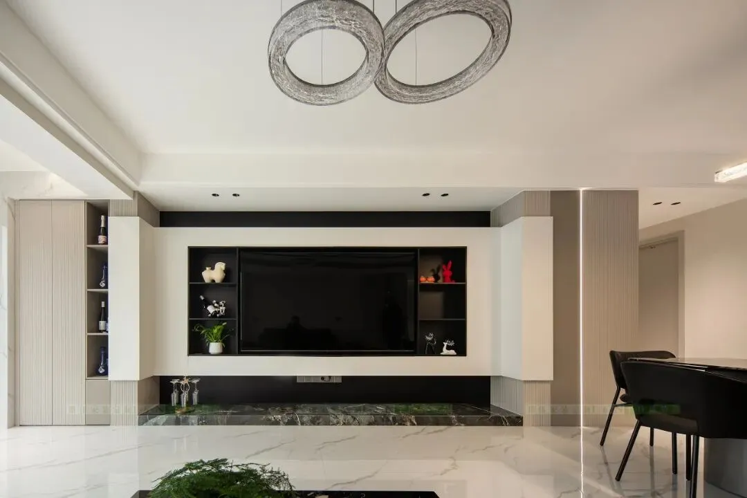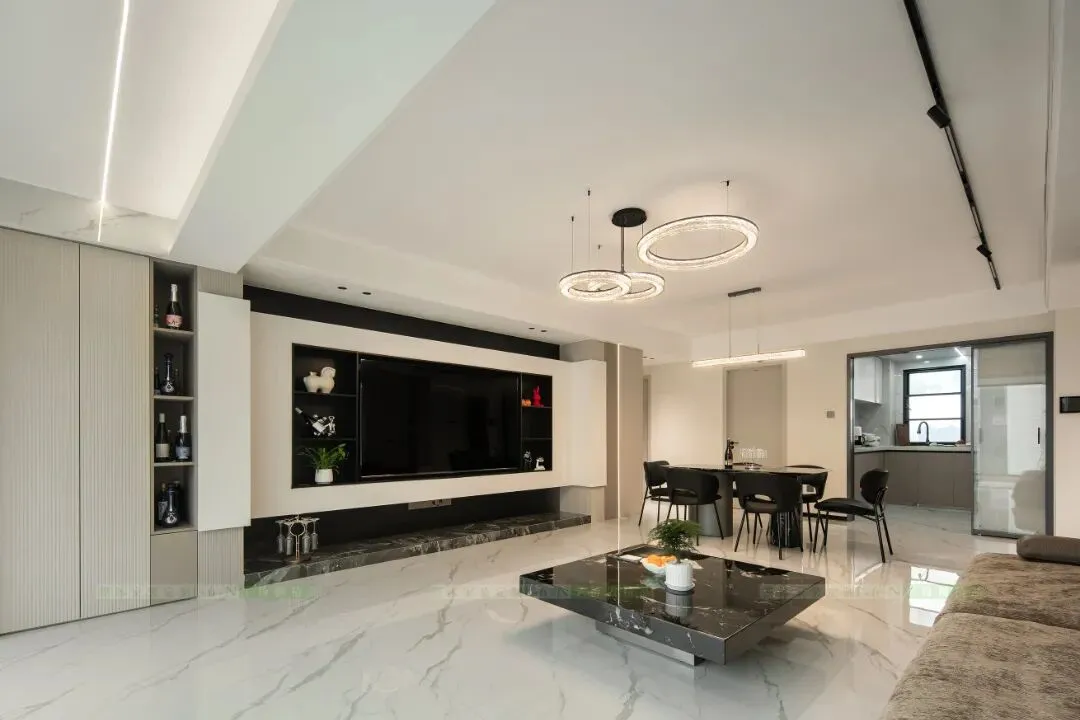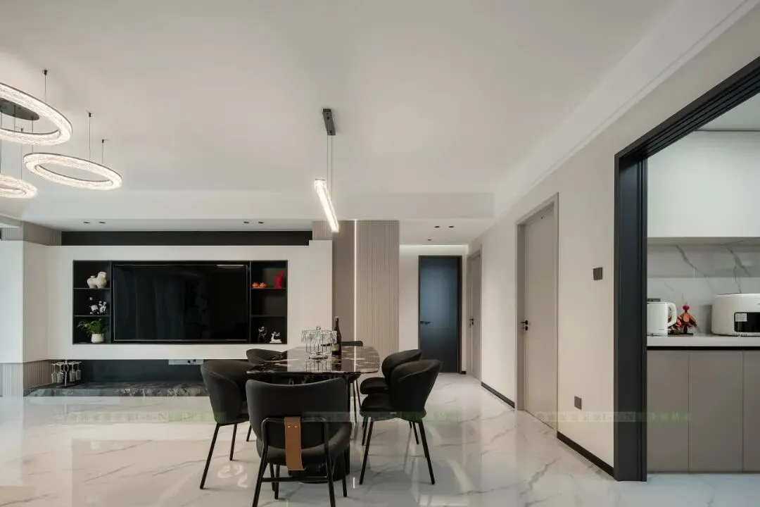 设计师采用连体设计,将材质和造型从电视主墙一直延伸至餐厅区域。