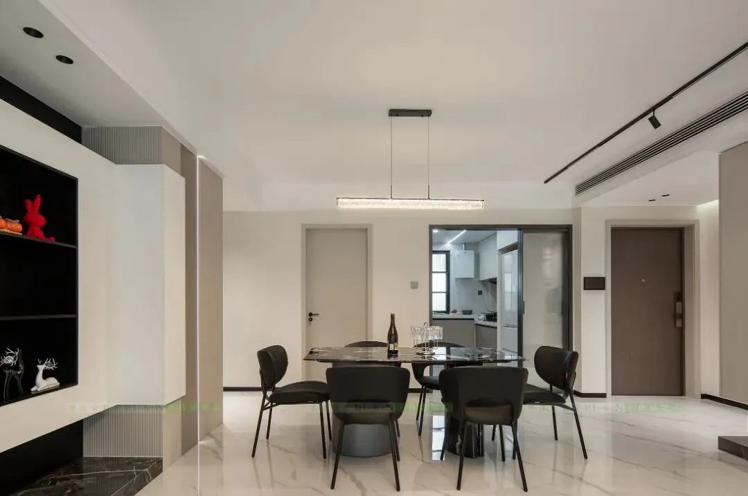 这种视觉上的拉伸感,让整个背景不再单调,像一根无形的线,将客餐厅两个功能区串联起来,空间感瞬间up up up!!