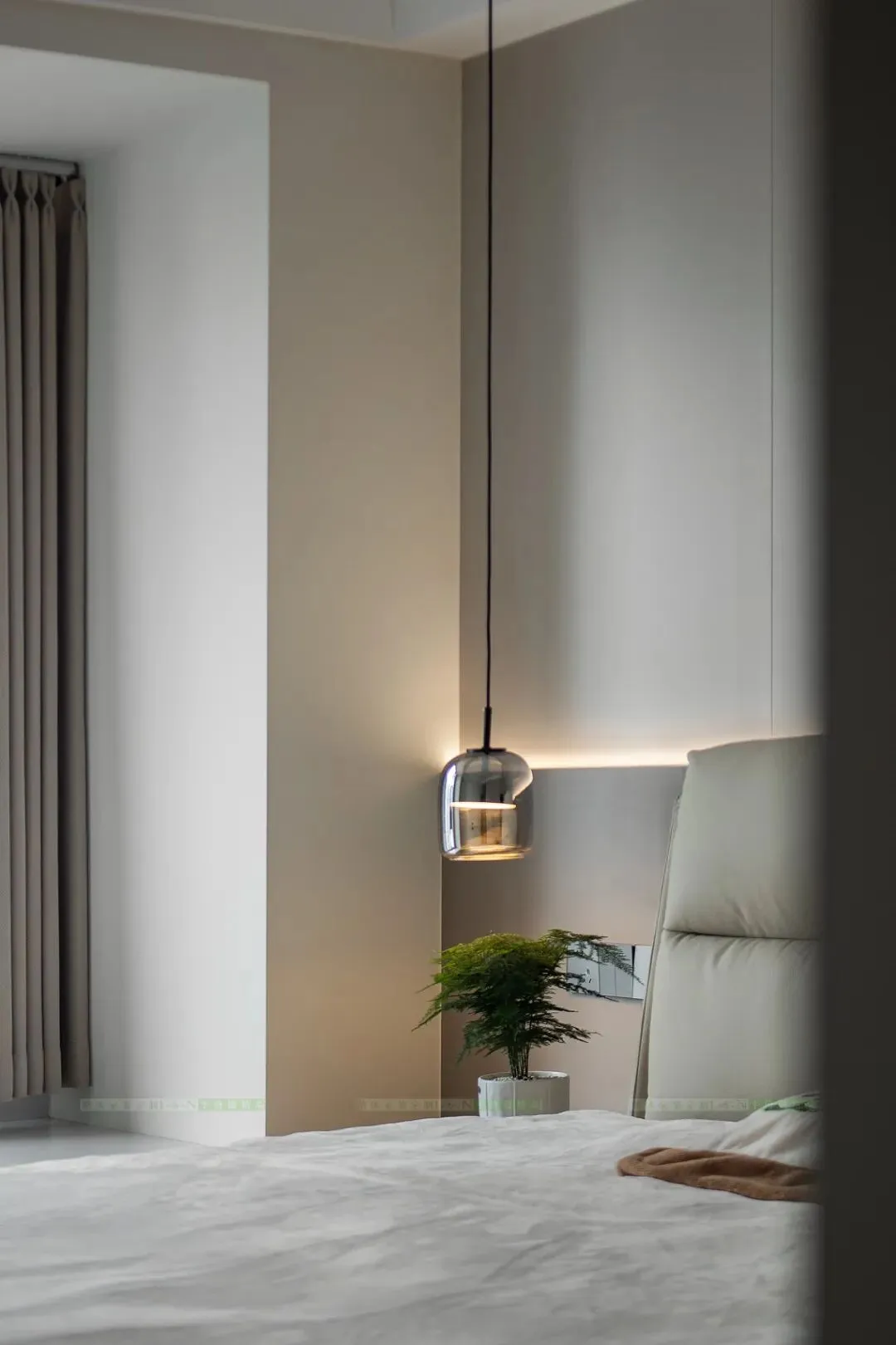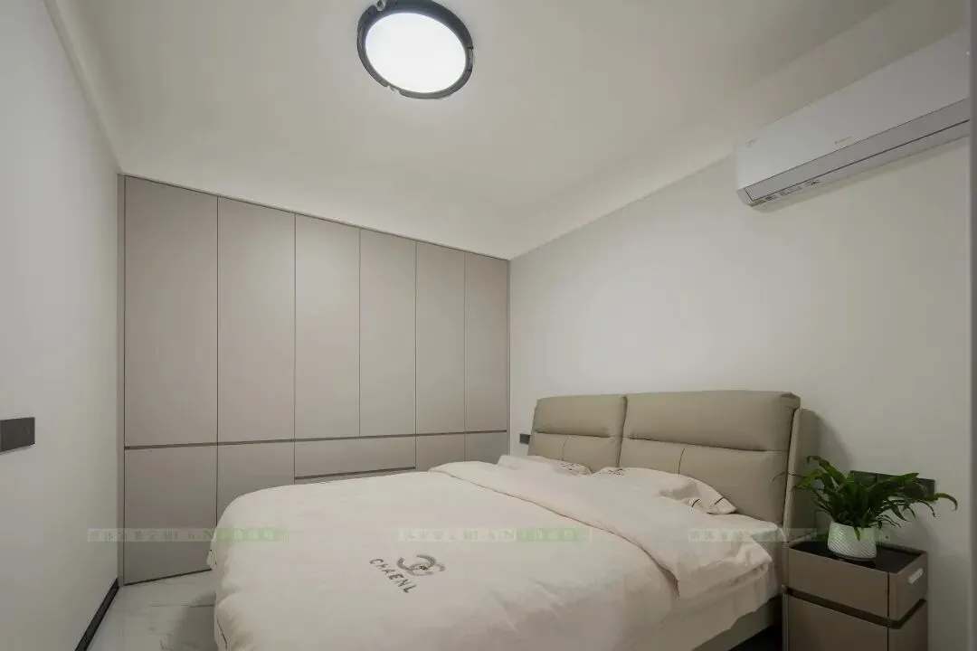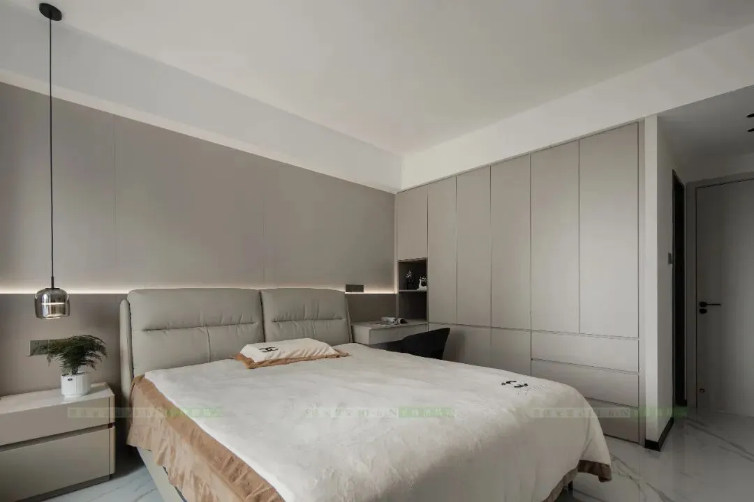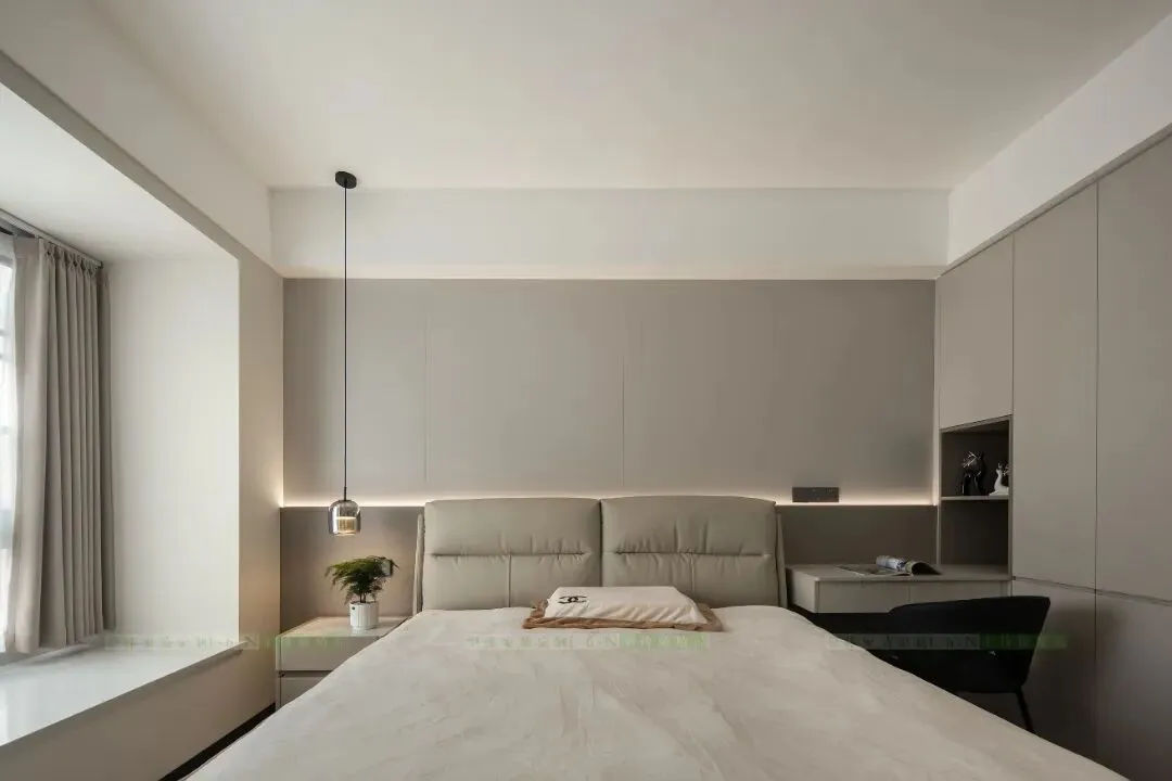 主卧一进门,目光便被床头吸引。采用了拼接式设计,简洁的线条勾勒出层次感,内嵌的灯带散发出柔和的光晕,像是给卧室披上了一层温柔的滤镜。