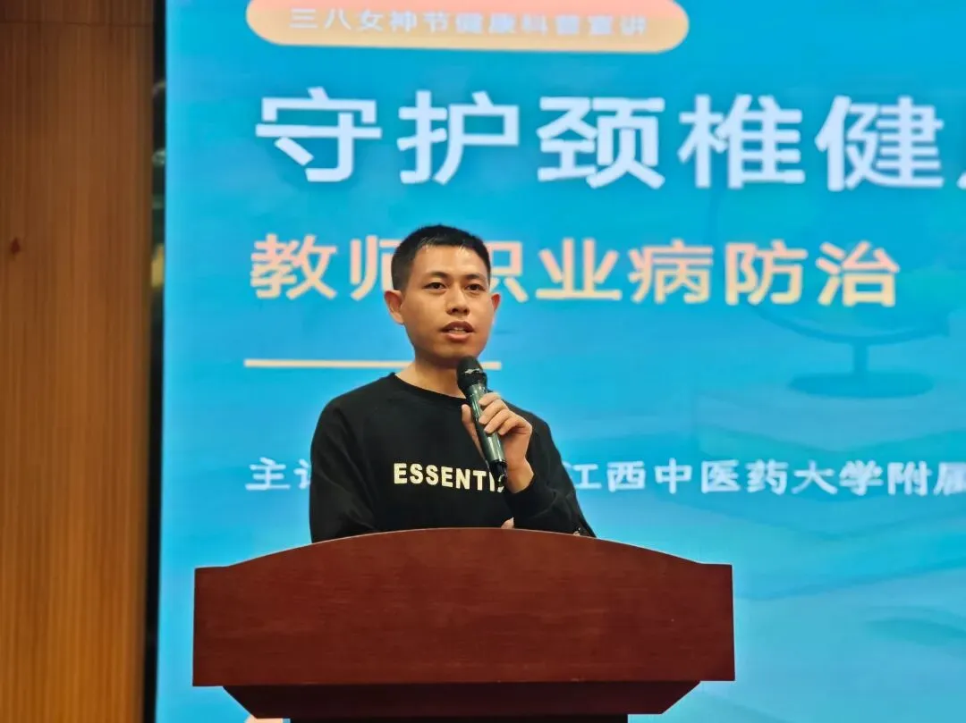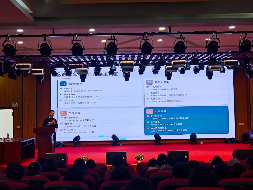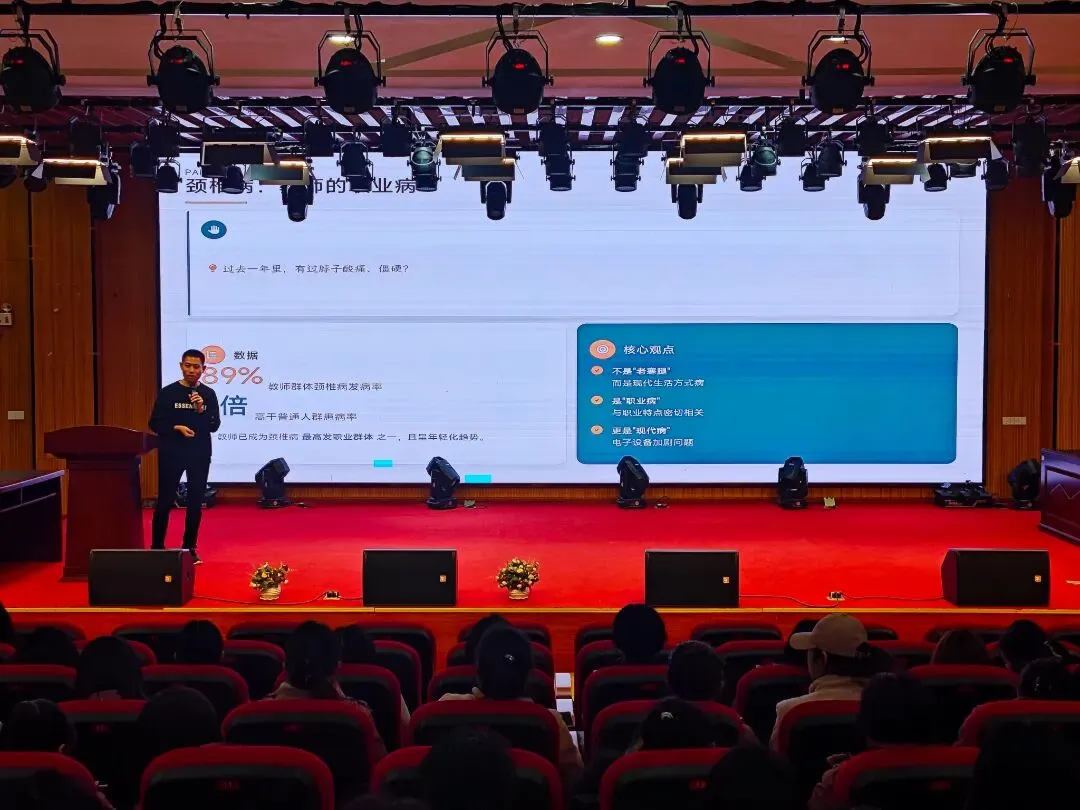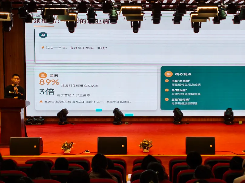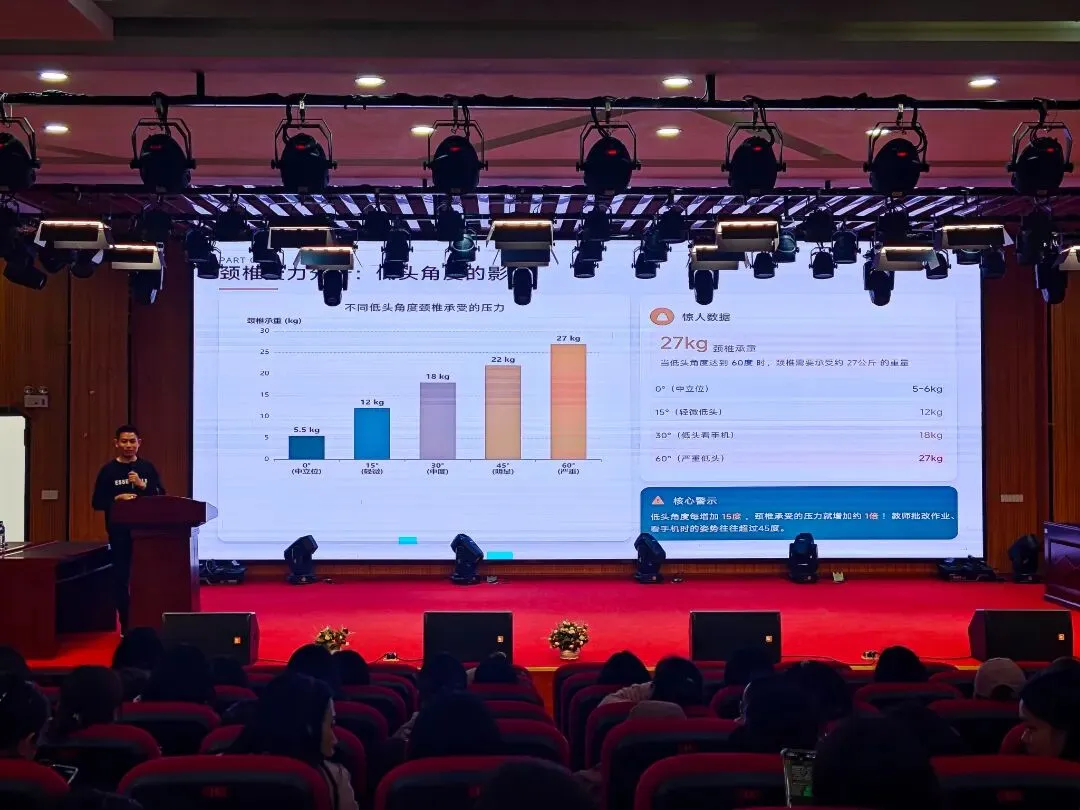 讲座聚焦教师群体高发的颈椎健康问题。许巍医生指出,教师因长期低头批改作业、僵直写板书等职业特性,加之不良姿势和工作压力,已成为颈椎病的高发人群,且发病趋势日益年轻化。他形象地解释,低头角度越大,颈椎承受的压力就越重,远超正常负荷。