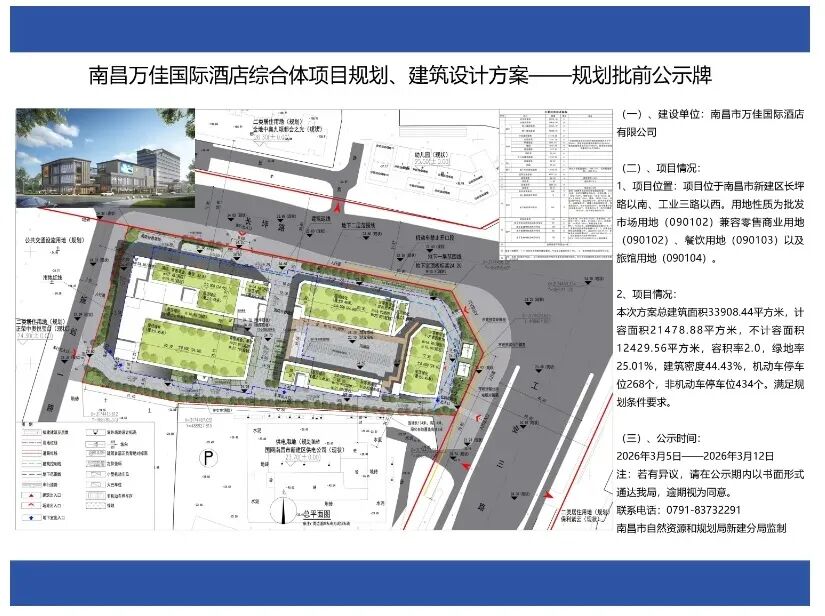 根据公示内容,项目位于南昌新建区长坪路以南、工业三路以西,由一栋酒店、零售商业、餐饮楼栋,以及零售商业、农贸市场组成,中央还设置了内庭院。