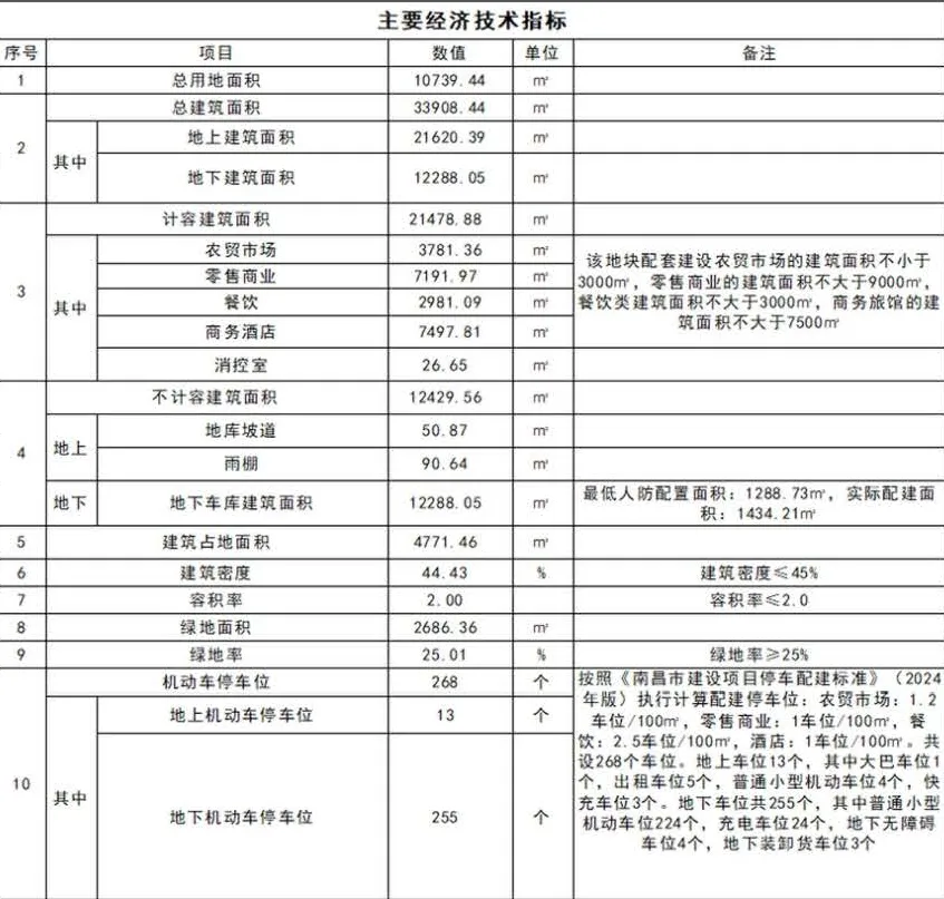 根据发布的经济技术指标,项目用地面积10739.44平方米,总建筑面积33908.44平方米,其中地上建筑面积21620.39平方米,地下建筑面积12288.05平方米,计容建筑面积21478,88平方米,农贸市场3781.36平方米,零售商商业7191.97平方米 ,餐饮2981.09平方米,商务酒店7497.81平方米。