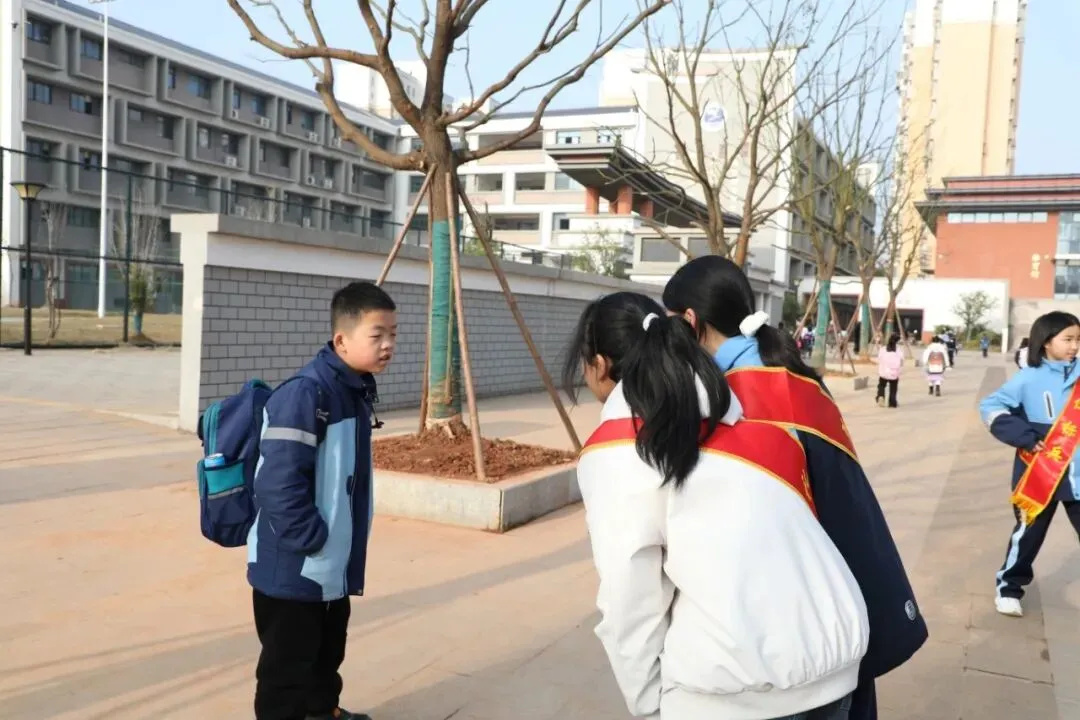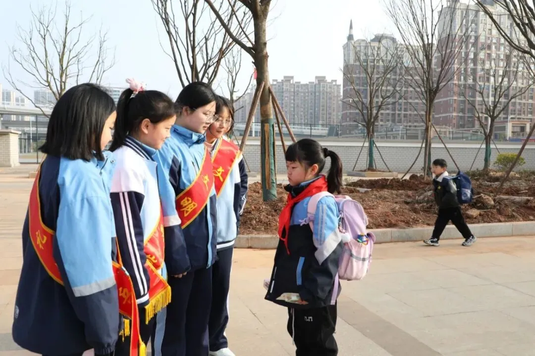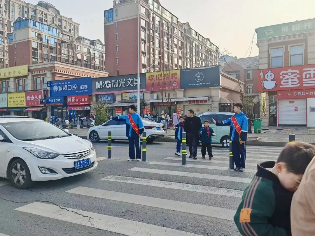 清晨上学高峰,校门口车流人流交织。第一志愿队在党员教师带领下,准时到岗值守。党员老师志愿者们身着志愿马甲,校级新时代好少年,学生会干部佩戴文明绶带,礼貌引导车辆有序通行、提醒行人走斑马线、帮扶低年级学生安全过马路。一句句温馨提示、一次次耐心守护,让拥堵路段变得井然有序,家长与路人纷纷点赞:“有这些孩子在,上学路更安心了!”