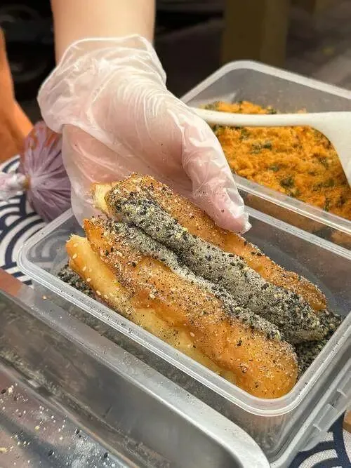还有“油条包麻糍”,这是对碳水最起码的尊重。刚炸好的油条酥脆,裹上软糯的麻糍和黑芝麻糖,咬下去,咔嚓一声,甜味和油香在嘴里打架,口感很奇妙。