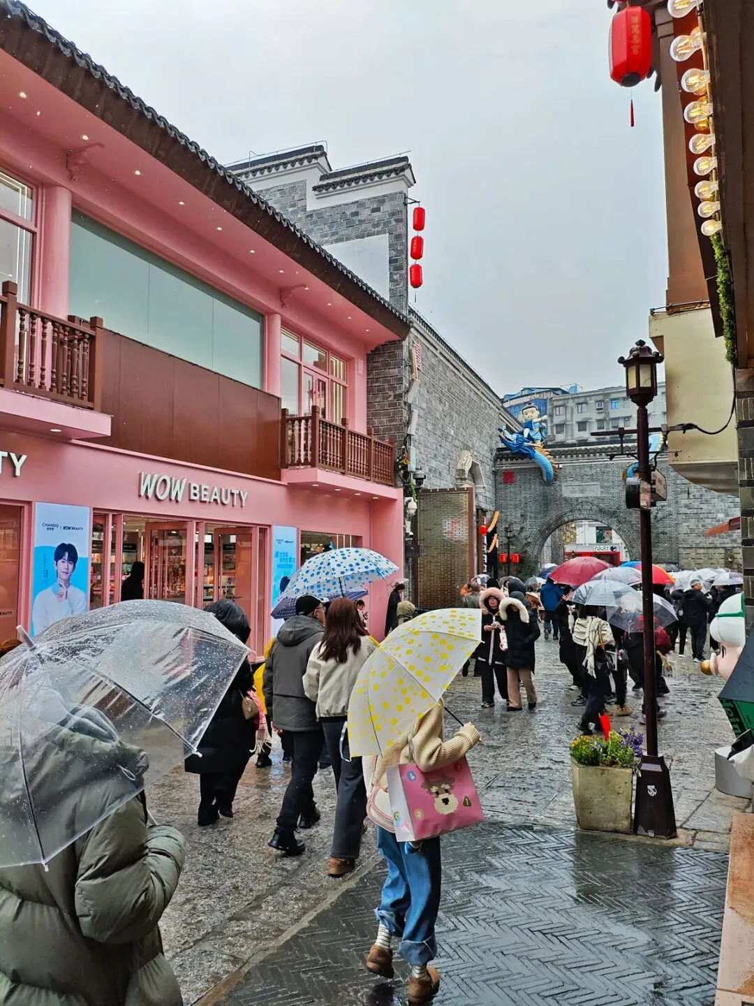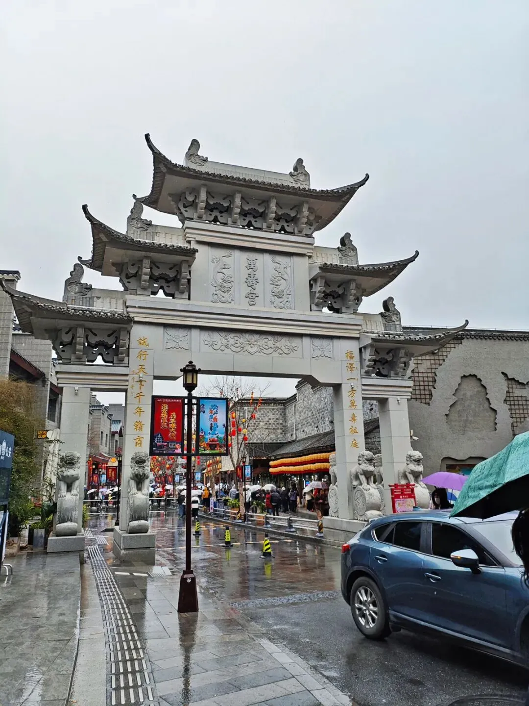 当日仅游览了街区部分区域——从牌坊进入后,因时间有限未能参观万寿宫本体和锁龙井。细雨中,街区依然游人如织,各色摊位、餐馆、火锅店人满为患,寻个用餐处着实不易。