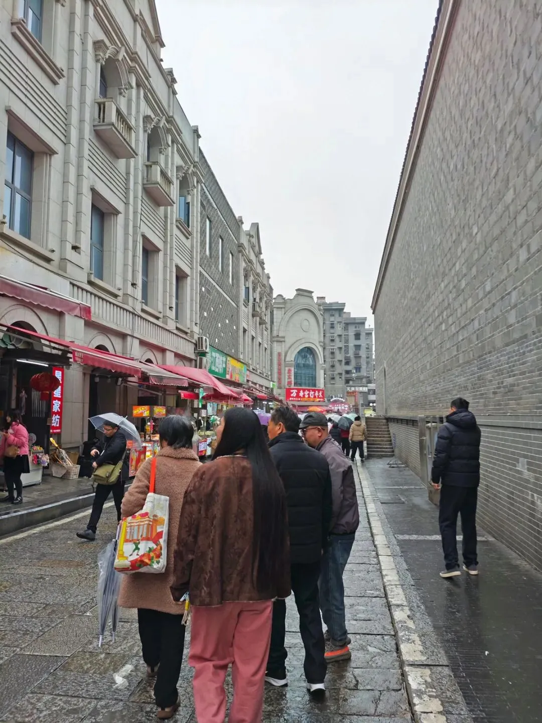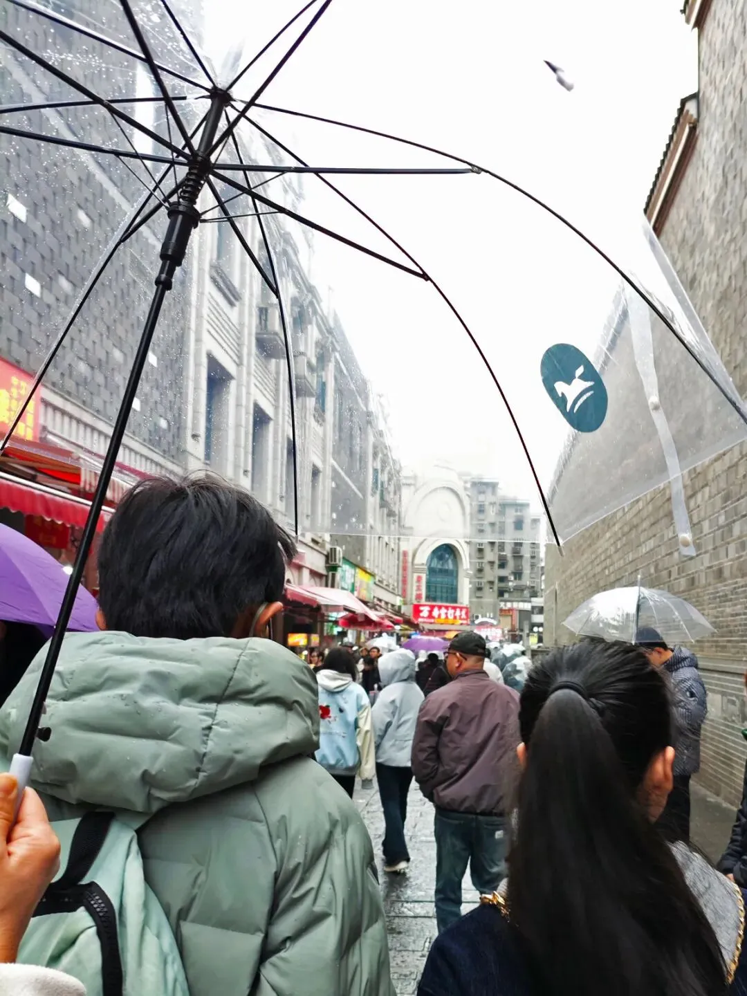 返回旅馆稍作休整后,一家人办理退房并寄存行李,此时已近正午,便前往万寿宫。行至途中,天空飘起细雨,雨势虽不大,却给出行带来不便。地铁口挤满撑伞的人群,避雨者与通行者交织,显得格外拥挤。