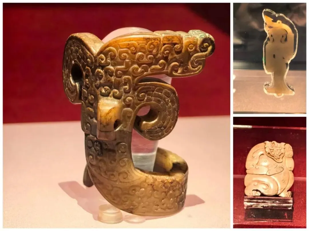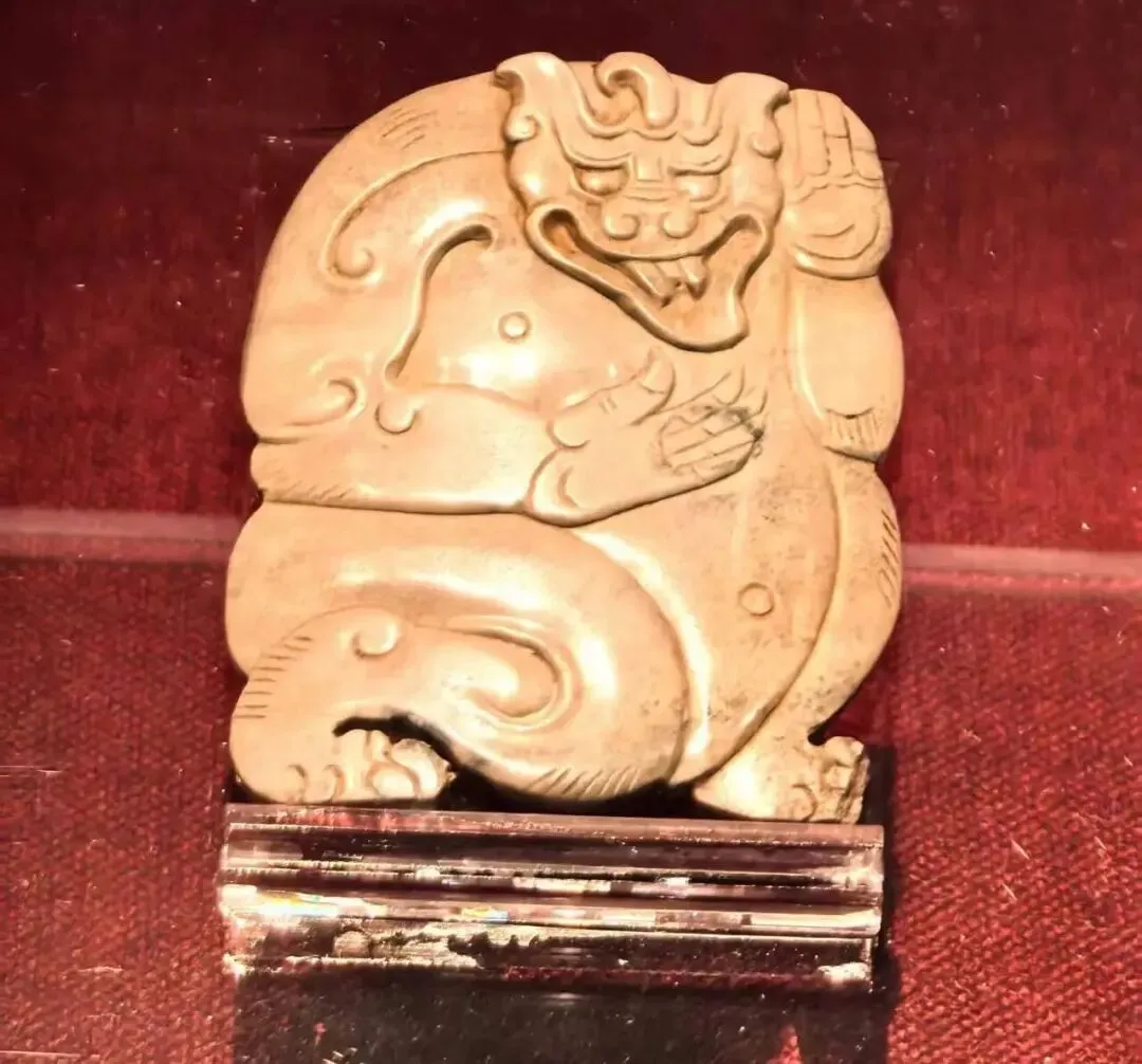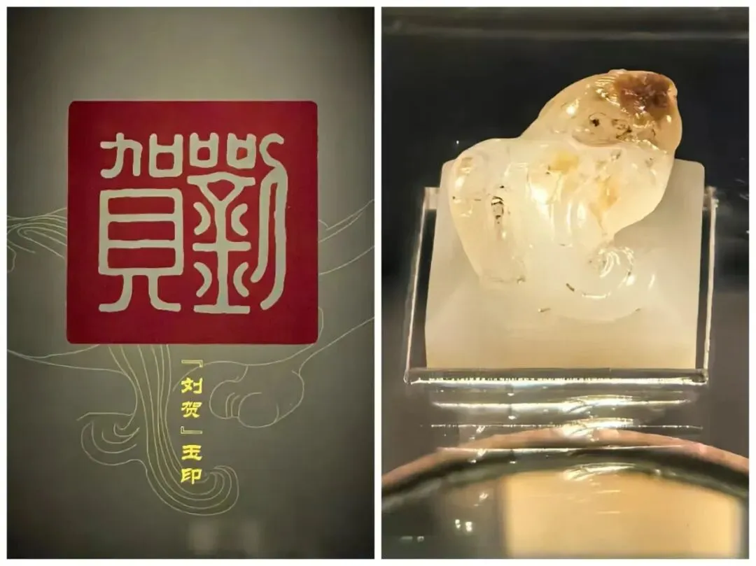 “刘贺”螭纽玉印,和田白玉,局部有浅褐色沁,螭纽,为汉代常见的“方寸之印”。印文“刘贺”二字为阴刻篆书,左右等分,字迹线条粗细一致,分割匀适,方朴端重。该印为揭示墓主身份是刘贺提供了最直接的证据。高浮雕兽形纽,头部呈三角形,伏身回首,双翅欲张,鳞片状羽毛,双爪微露,尾卷曲,形态生动。