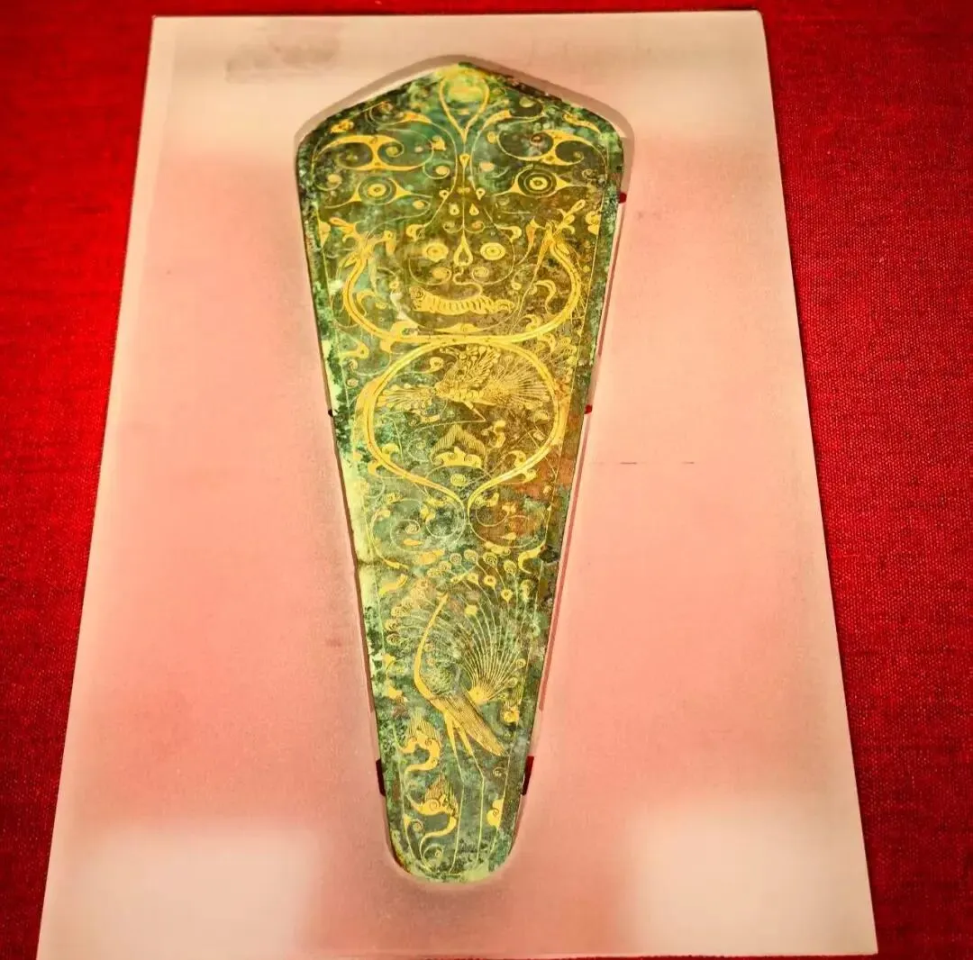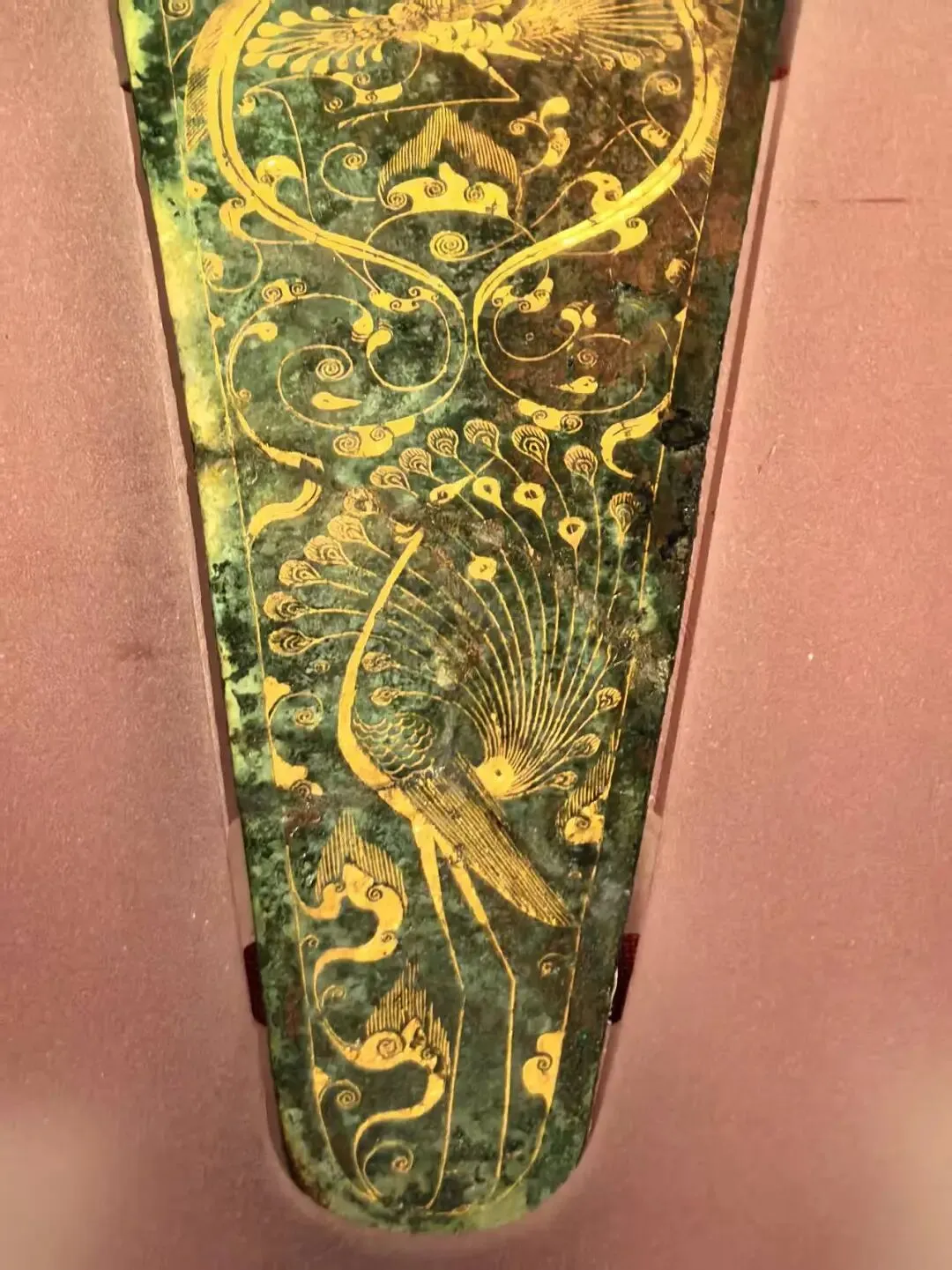 Bronze Lantern in the Shape of a Fish in a Wild Goose’s Beak. A Han innovation using a smoke tube to channel fumes into the hollow body for purification; this single‑tube example depicts a goose with turned head. The fish body, goose neck and cavity connect so smoke is absorbed by water inside, reducing pollution. Two curved shades rotate to block wind and adjust light. Practical yet artistic, it blends technology, ritual culture and aesthetics.