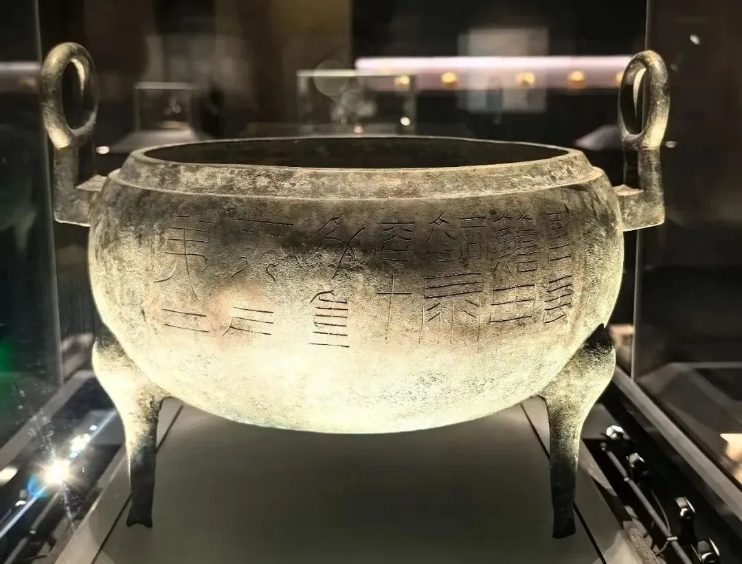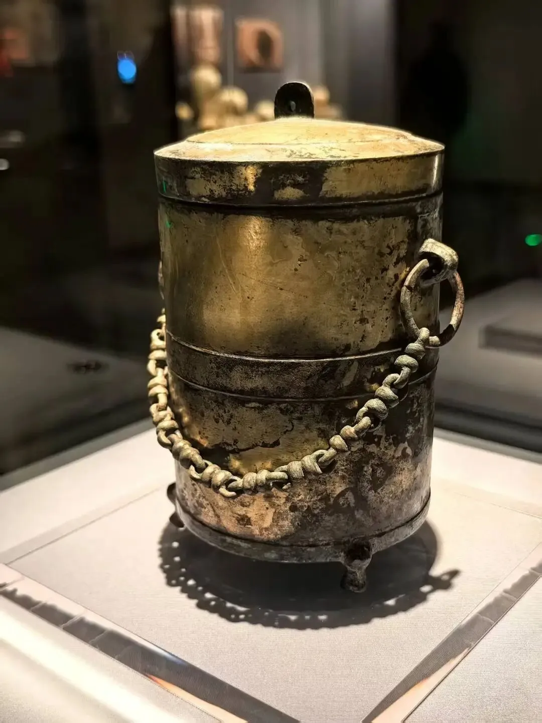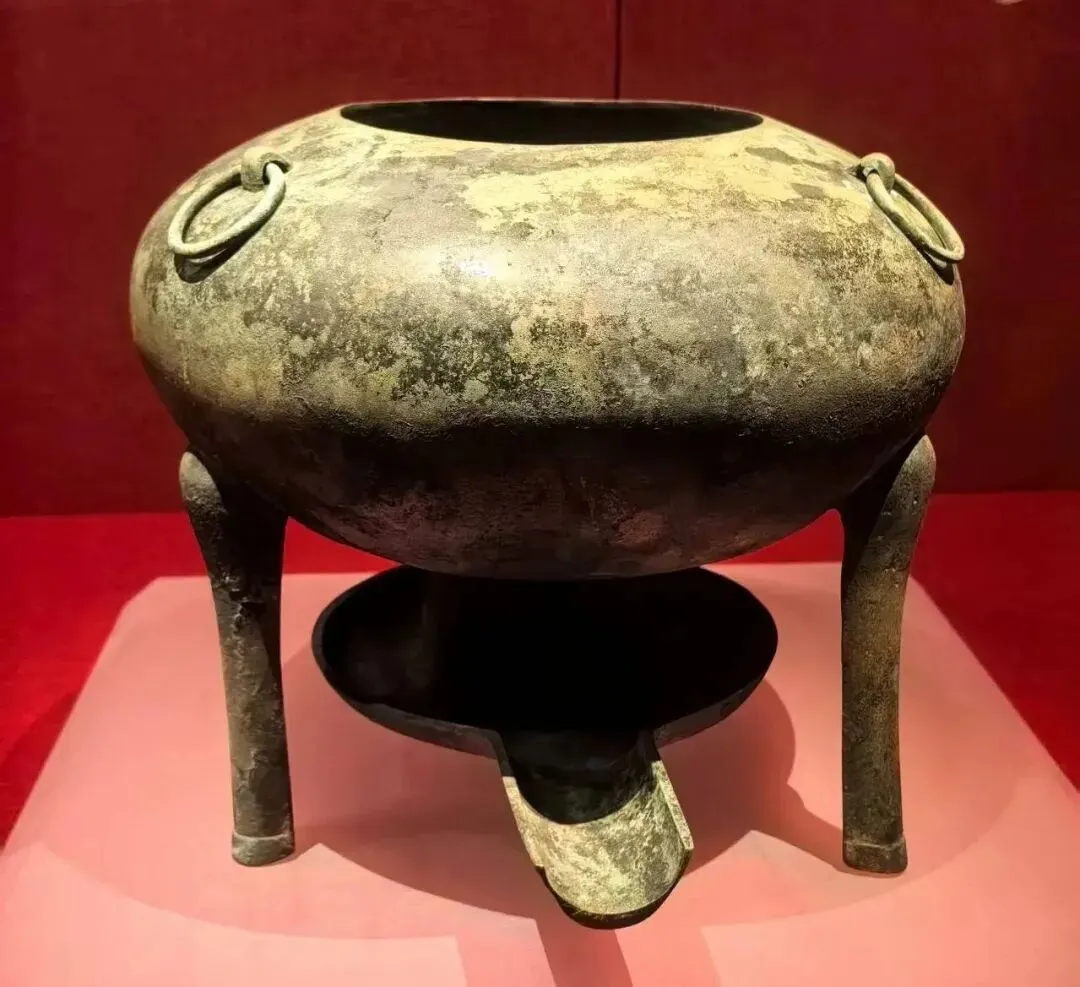 蹄足环耳青铜温鼎,虽然也是三足的青铜器,但器型上看,上端是一个肚大口小的容器,便于盖上盖子,圜底下有以圆筒形炉腔,下端连接着一个炭盘,用于放置炭火,炉盘一侧带流,可用于清扫炭渣。鼎内有板栗等残留物,炭盘里有炭迹。俨然是个“实用型火锅”。经过验证以及与古籍对照,专家们论证,这个就像铜火锅一样的东西,实际上是“温鼎”。“温鼎”一词在古籍中并不少见,出现时间甚至可以追溯到宣商周时期。古时候,生产力虽低下,但贵族们的日子却过得很滋润,为了防止冬天餐饮食物变凉,于是,发明出的“保温锅”,通过内置炭火,以保证鼎内食物温热不冷。