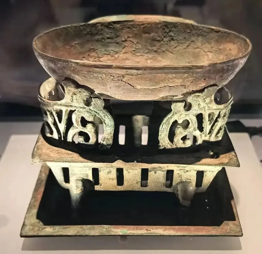 Bronze Sauce Heating Stoves. A mid–late Western Han combined cooking‑and‑serving vessel used by elites. Three parts: an ear‑cup for sauce, a hollow central furnace for charcoal, and a rectangular ash tray; charcoal heated the sauce for dipping sliced meat (rùròu), the “ran” practice that gives the vessel its name.