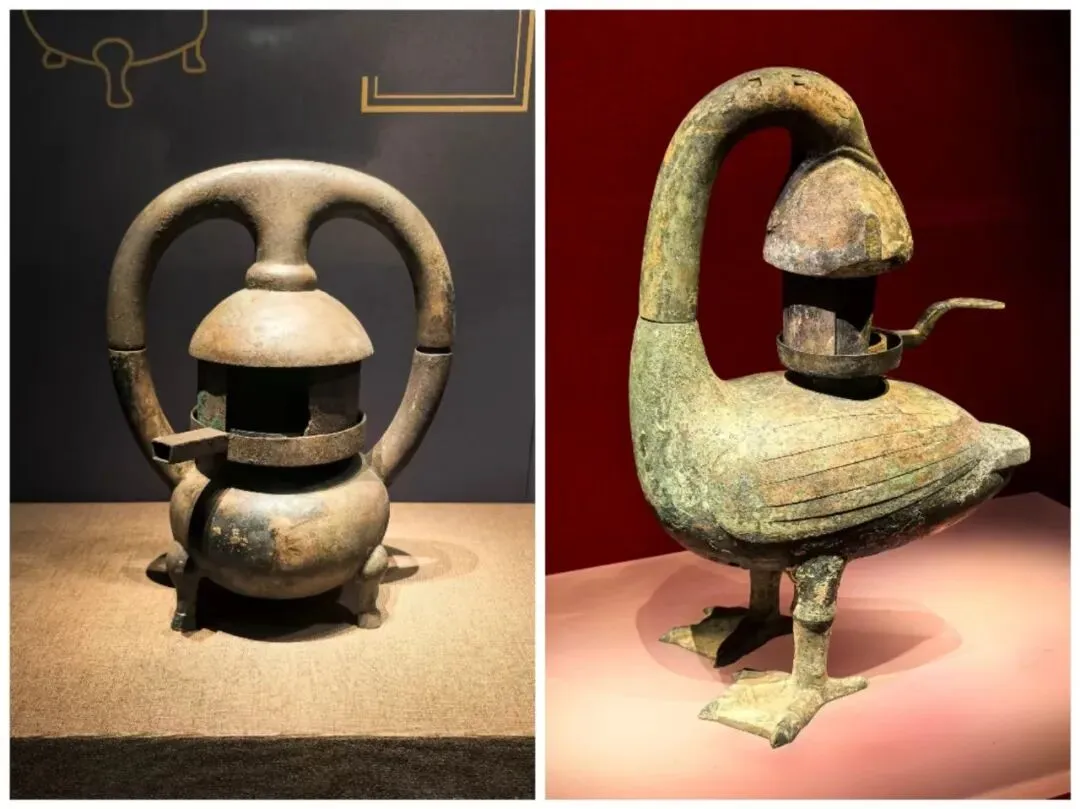青铜雁鱼灯(图右),海昏侯墓葬共出土一组两件。汉代新创制一种精巧的灯型,是装有烟管的灯,灯管有单管、双管两种,都能将烟气导入灯腹之中净化。该灯为单烟管灯,整体造型呈现鸿雁回首伫立的姿态,由雁首颈、雁体、灯盘、灯罩四个部分套合而成。鱼身及雁颈、体腔都是中空相通的,灯火点燃时、烟雾可以通过鱼和雁颈导入雁体内,被其中贮存的清水吸收溶解,以达到环保无污染效果。两片弧形的灯罩可以左右转动,既能挡风,又可以调节灯光亮度。其将科技、文化与审美融于一体,兼具实用与艺术双重功能。雁自古被视为“仁、义、礼、智、信”俱全的灵物,其嘴中鱼亦具多子多福、夫妻恩爱、金玉满堂等吉祥寓意。部分灯具可以贮水,达到净化烟尘的作用,实实是个“环保灯”。