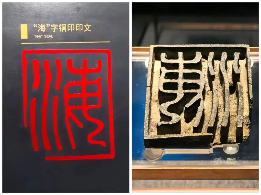“海”字铜印,正面朱文铸一“海”字,字腔深峻,字口垂直,字底平净,背部呈多面体覆斗形,中部有口字形残缺,无印纽。“海”是对“海昏”的缩写。是西汉时期关于地点常见的省略现象。这枚铜印体形硕大,尺寸远大于汉代方寸之印,专家推测其为烙马印。烙马印又称火印、打马印,一般为铜印或铁印,印纽上部有孔可装入木柄。这枚“海”字铜印出土于娱乐用器库中,与车马库相邻,是刘贺实施马政管理的证明之物。