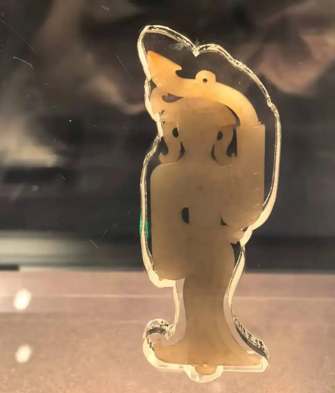 2-舞人玉佩,片状和田白玉,有淡黄色沁。双面透雕站立的舞女人像,边缘圆润。舞者瓜子形脸,眼眶斜削,直鼻小口;额头前发梳起呈扇形,脑后长发编辫,卷发飘扬垂于两耳、长至肩部;身穿交领长袍,腰束带,左臂扬起高于头顶作舞姿,右臂平放横在腹部,领口、袖口和衣缘处均有图案装饰,衣长拖在地面。玉佩上下均有一穿孔,可以用来穿戴。起伏的衣裙、婀娜的舞姿,栩栩如生、灵动传神,是美与自然的完美结合。