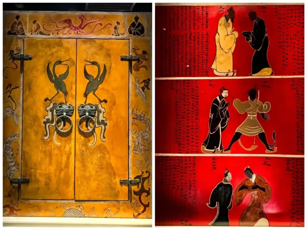 孔子徒人图漆衣镜(图片为仿制):屏风类器物,由镜盖、镜框和青铜镜三部分构成,是中国考古史上首次发现由铜、漆板构成面板的衣镜。其中镜盖和镜框为木质髹漆。镜掩的正反两面均有彩绘图像和墨书文字,正面墨书为介绍衣镜功能及上面图案的汉赋,彩绘图像有仙鹤等。反面是孔子及孔子弟子图像和传记,为迄今已知最早的孔子画像,体现了汉代“崇儒”的文化风尚。镜框为长方形,由厚方木和背板围成,内框镶嵌铜镜。镜框的表面髹红漆,内框四周边框正面绘有一圈神兽及仙人图案,上方中间是神鸟,两侧端坐着两位仙人,左侧饰白虎,右侧饰青龙。