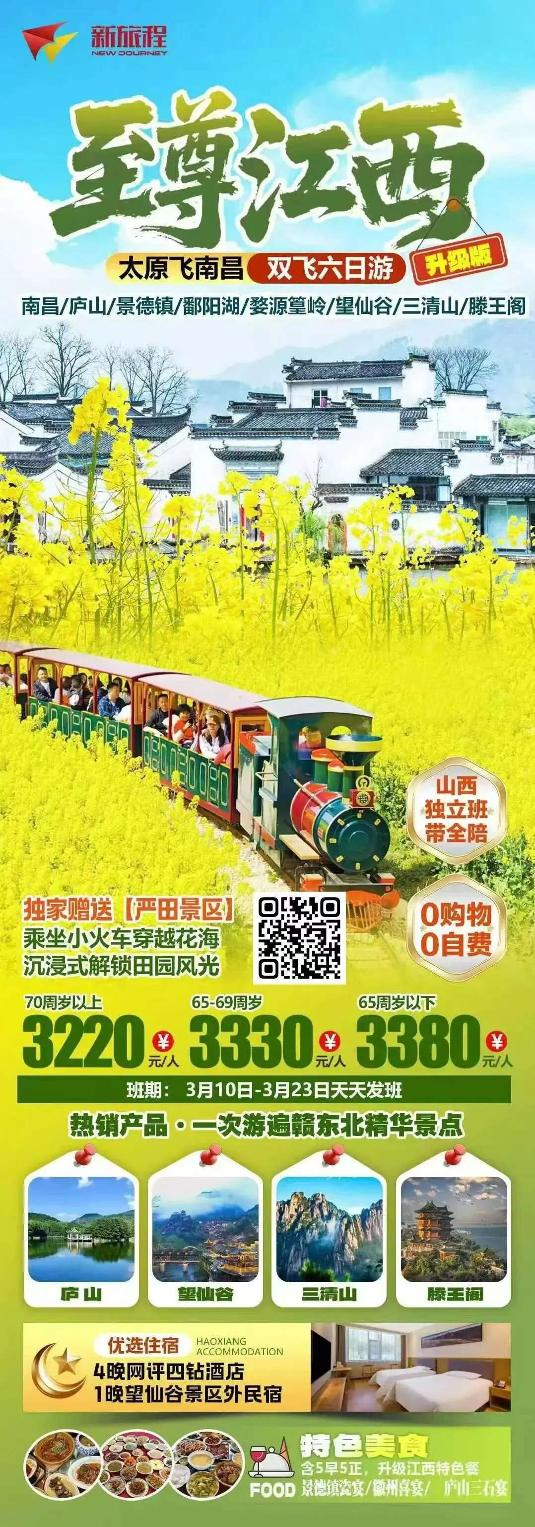 太原出发|纯玩至尊江西双飞6日游,南昌/庐山/婺源篁岭/望仙谷/景德镇/三清山/滕王阁,纯玩不进店不推自费,独家安排严田小火车逛花海