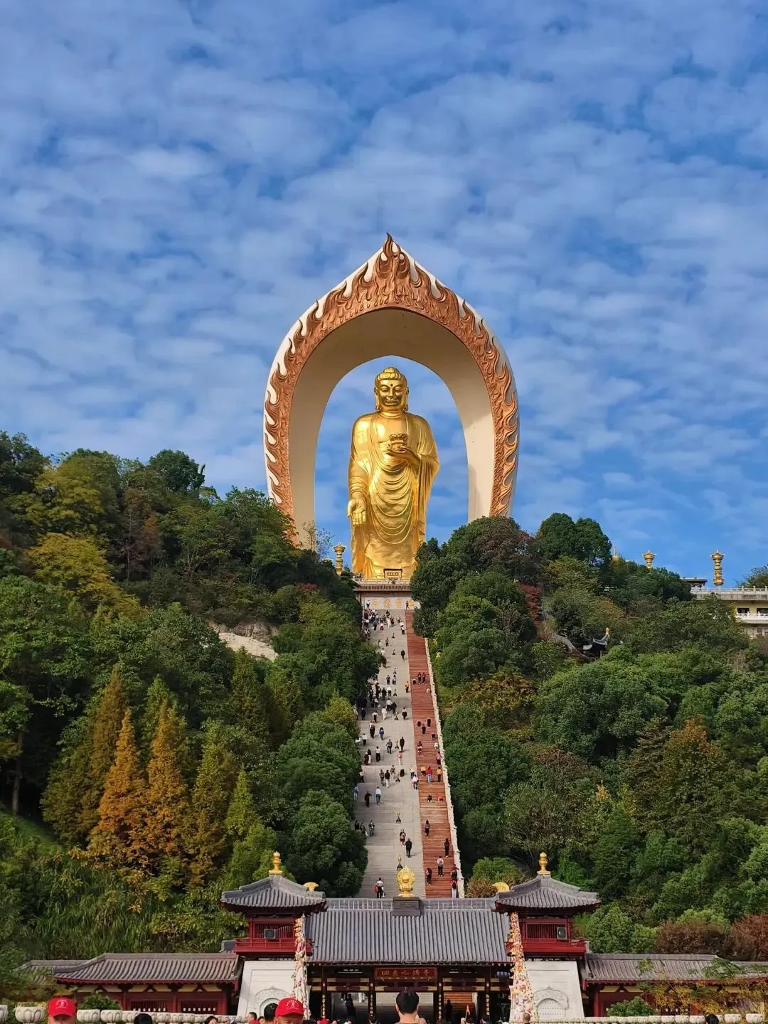 早上南昌地铁2号线滕王阁地铁站2号出口中山西路5号停车场,出发【东林大佛】,东林大佛由庐山东林寺肇建,2007年5月动工,2013年5月建成,8月举行开光大典。佛像身高48米,以表阿弥陀佛发的四十八大愿;总高81米,为至火焰宝盖顶点之距,表示九九八十一难,意为修行成佛的艰辛不易;底座为48瓣莲台,是世界上最高的阿弥陀佛像铜像。