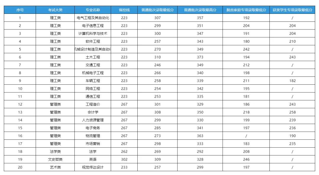 南昌交通学院2025年专升本分专业完整录取数据如下,含普通批次、脱贫家庭专项、获奖学生专项的录取最低/最高分: