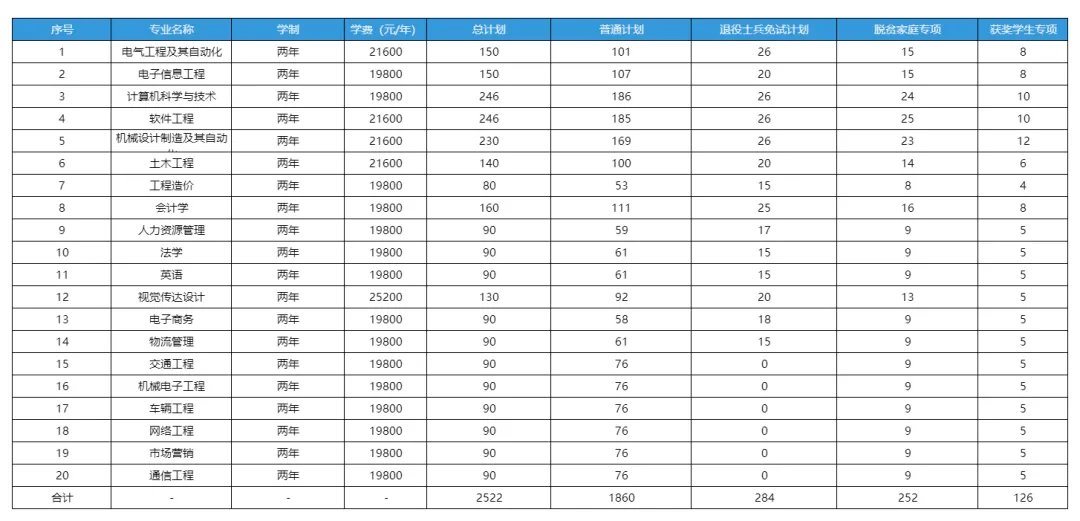 2025年该校专升本总招生计划2522人,共20个招生专业,院校代码8306.具体分专业计划如下: