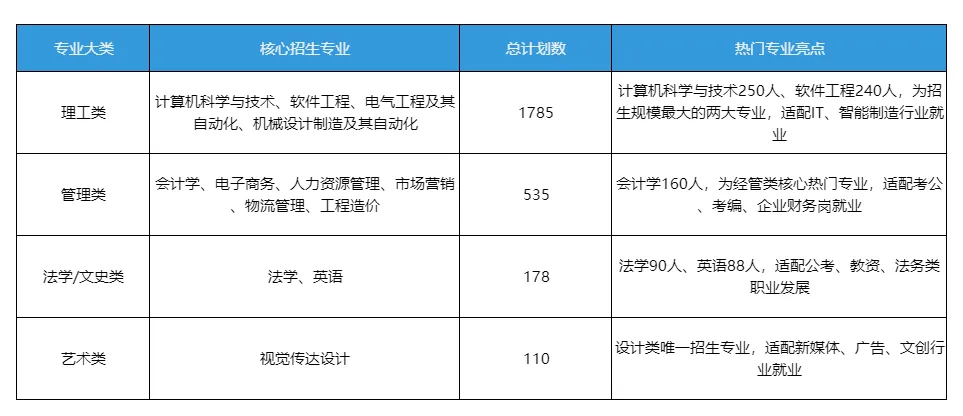 2026年该校专升本总招生计划2573人,共21个招生专业,新增交通运输专业,所有专业均设置普通计划、退役士兵免试计划、脱贫家庭专项、获奖学生专项,学费标准与2025年基本一致,无调整。