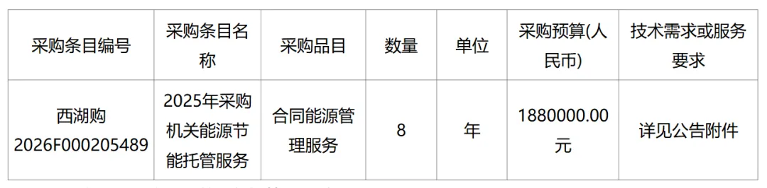 3月6日,江西省南昌市西湖区住房和城乡建设局2025年采购机关能源节能托管服务项目竞争性磋商采购公告发布,预算金额188万元,托管期限8年。