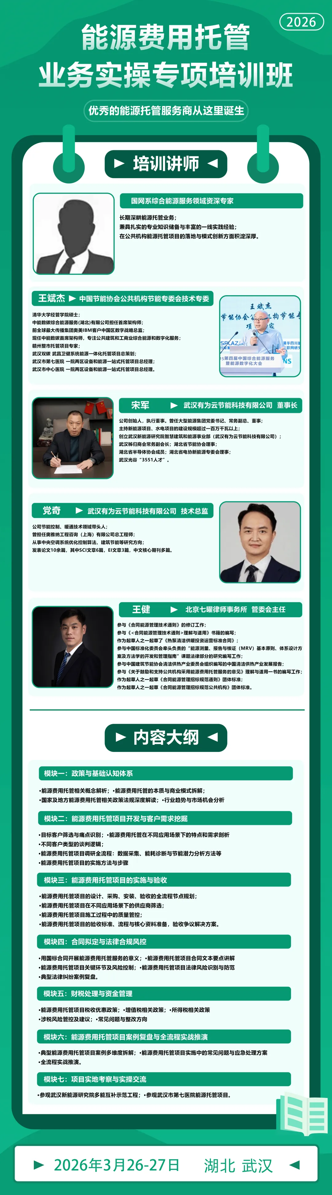 从政策解读到项目落地,从客户开发到风控合规,5位专业讲师,2天沉浸式实战教学,2个标杆项目参访,3月26-27日,湖北武汉,能源费用托管业务实操专项培训即将召开!