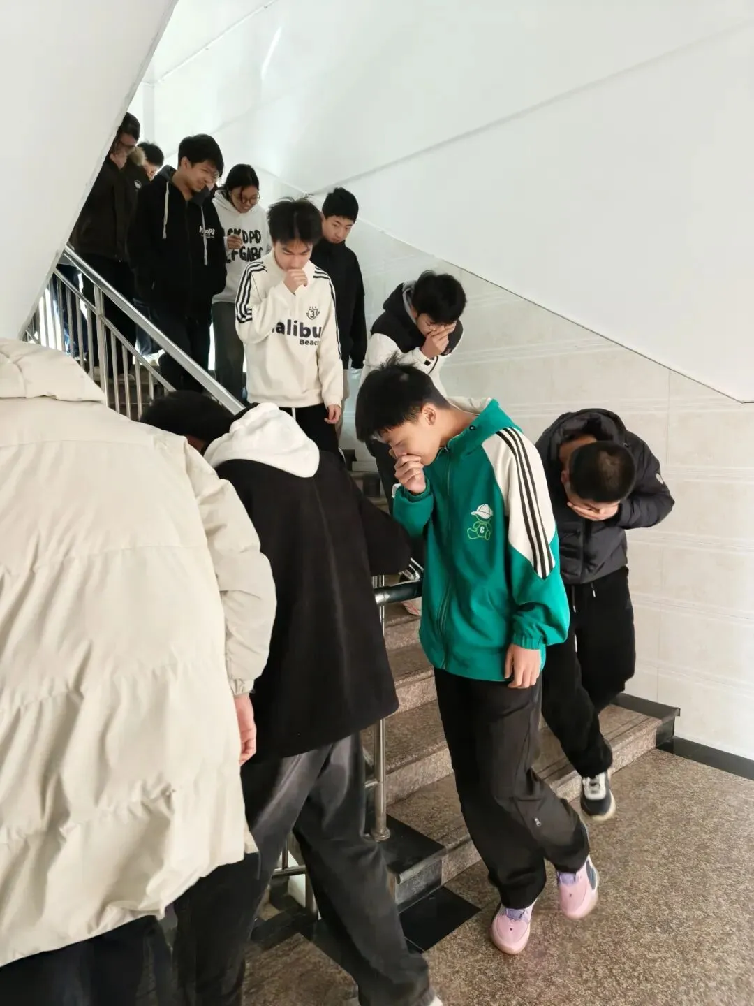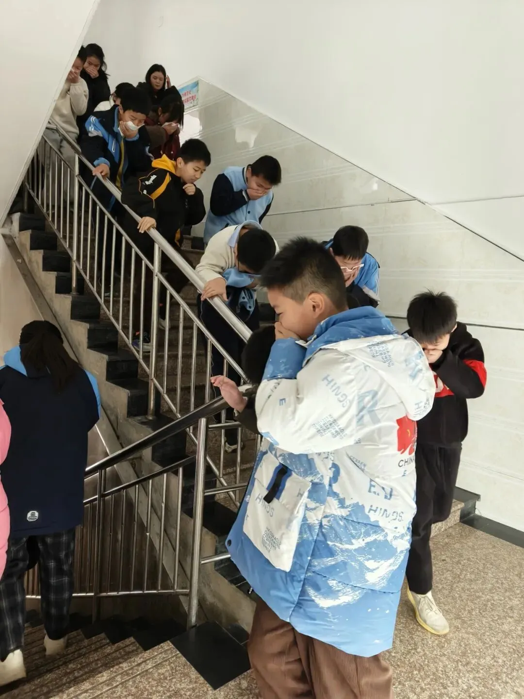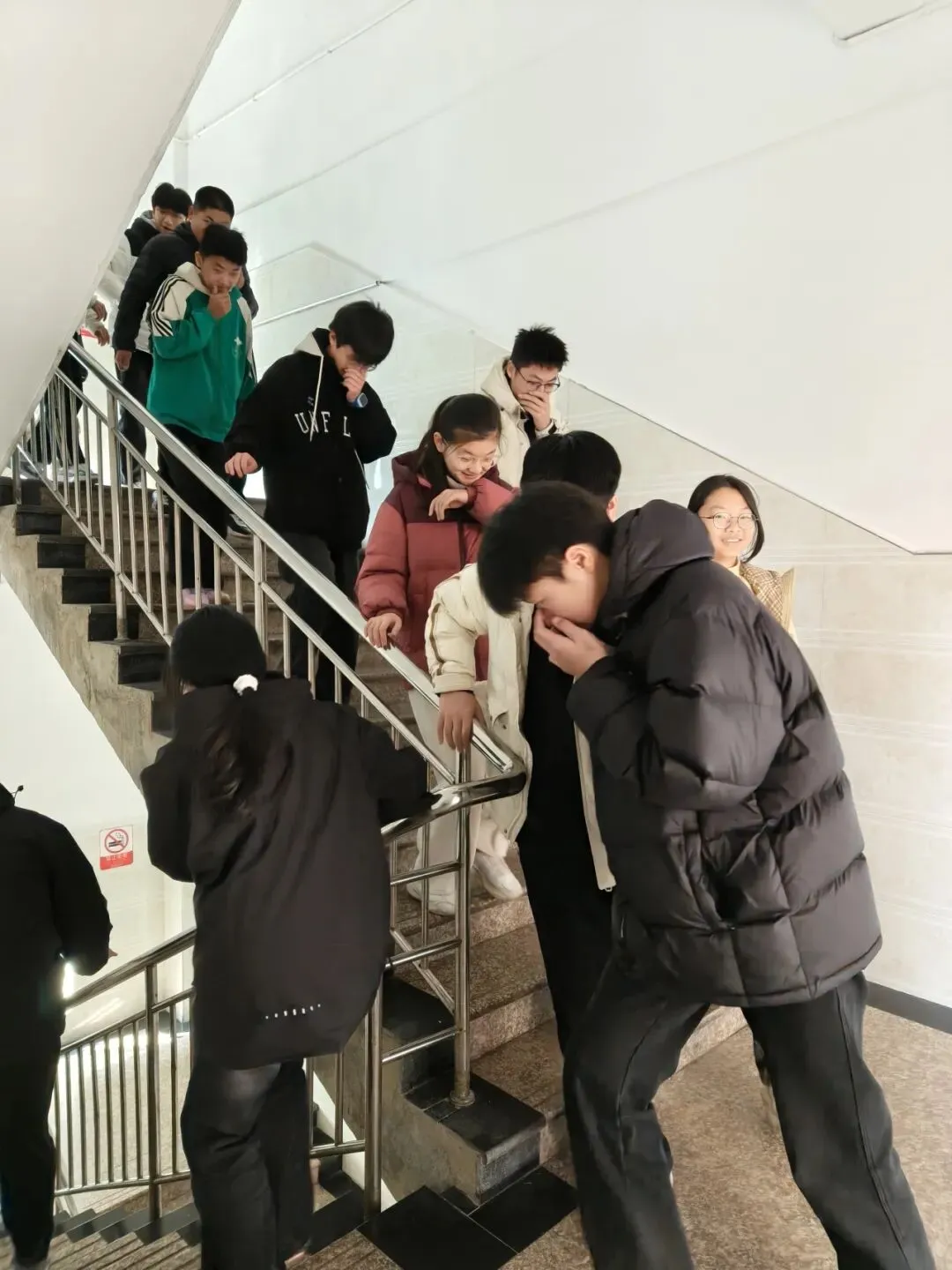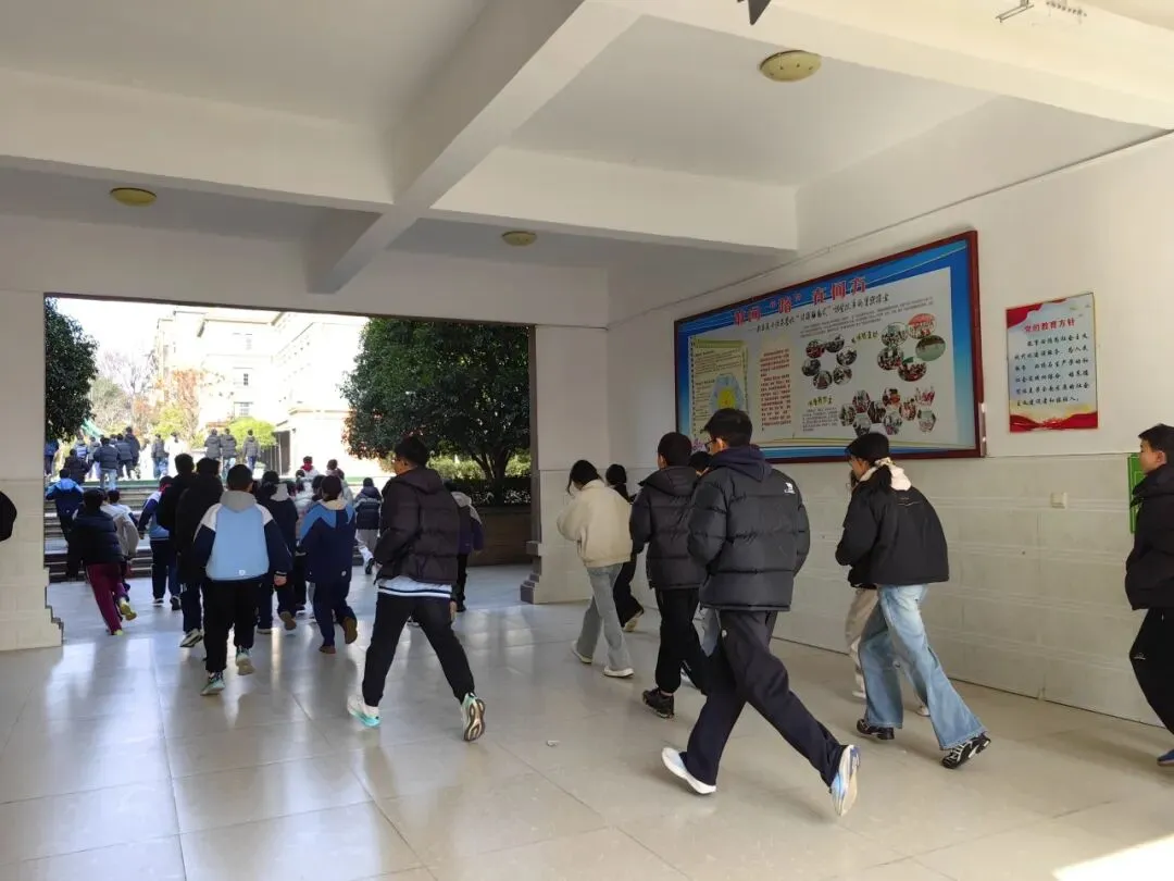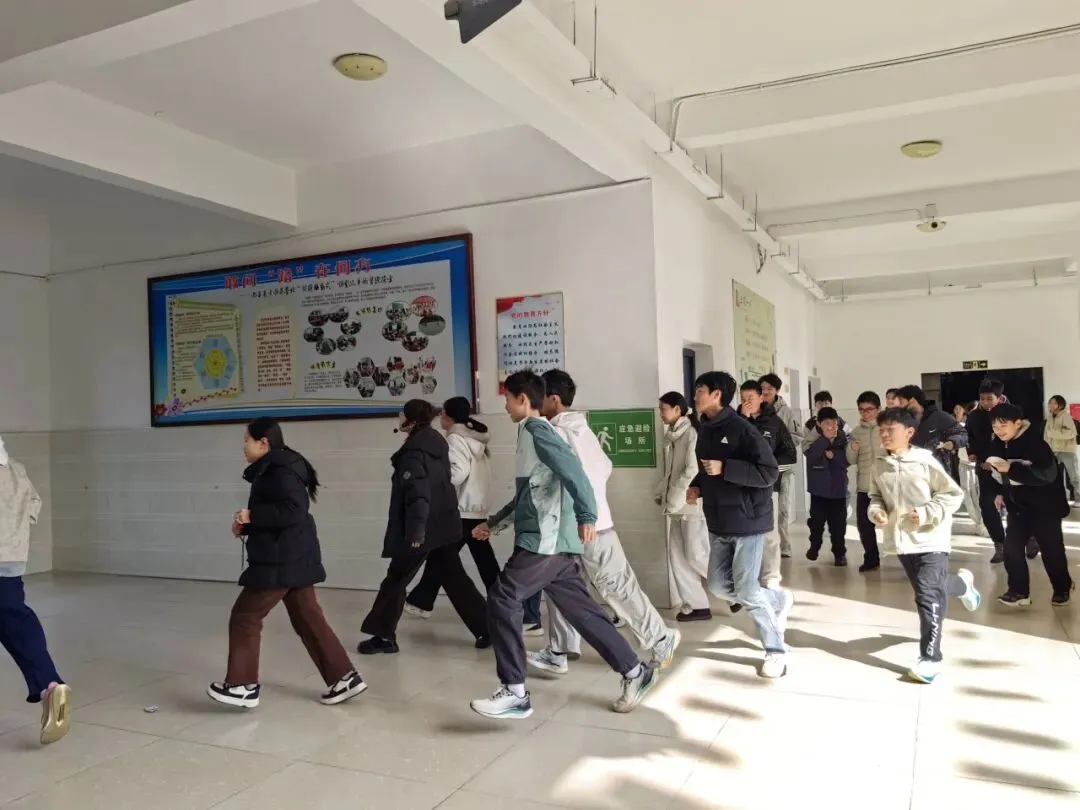 楼道内,各疏导组的老师们早已就位,他们沉着冷静地指挥学生分流通过,不断提醒学生“不要慌张,不要推挤,注意脚下安全”,确保整个疏散过程安全顺畅。